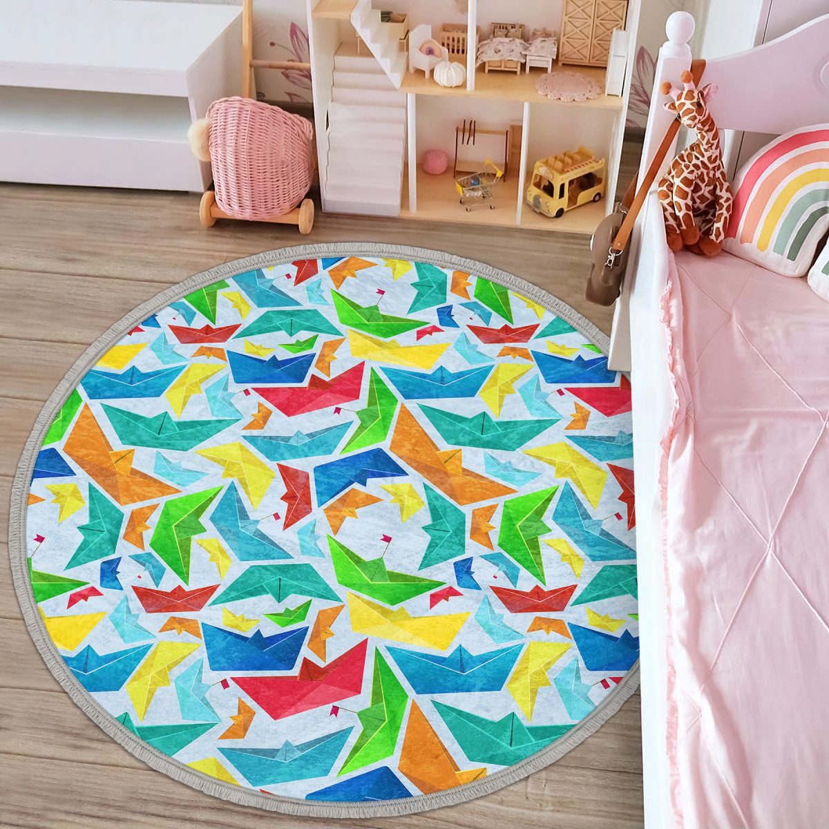 Mavi Zeminde Origami Gemiler Çocuk & Genç Odası Makinede Yıkanabilir Kaymaz Tabanlı Püsküllü Yuvarlak Çocuk Halısı