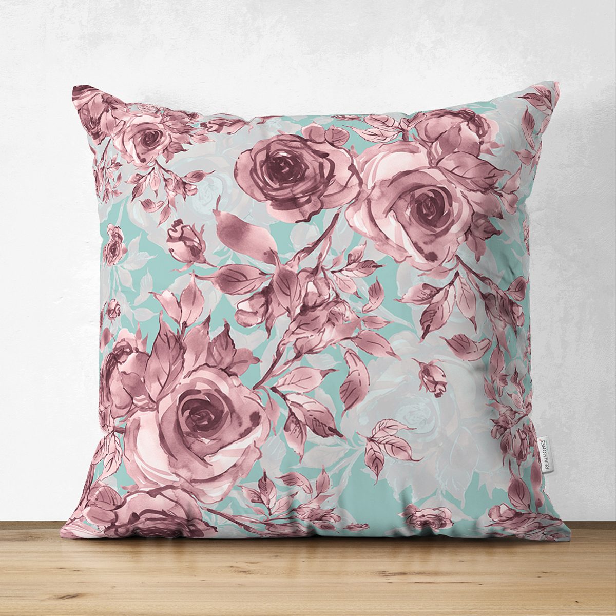 Mavi Zeminde Pembe Güller Motifli Çift Taraflı Dekoratif Süet Yastık Kırlent Kılıfı Realhomes