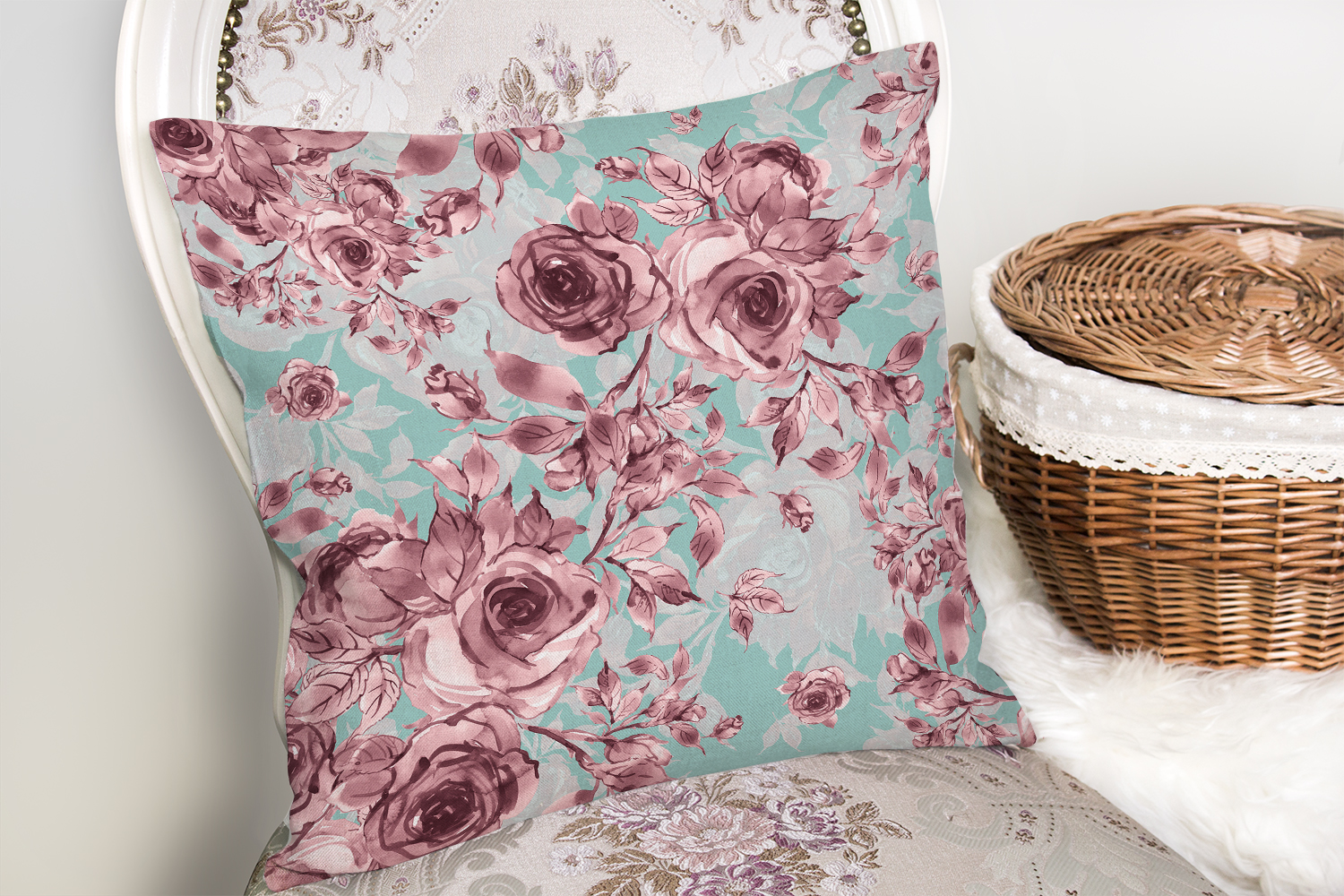Mavi Zeminde Pembe Güller Motifli Dekoratif Yastık Kırlent Kılıfı Realhomes