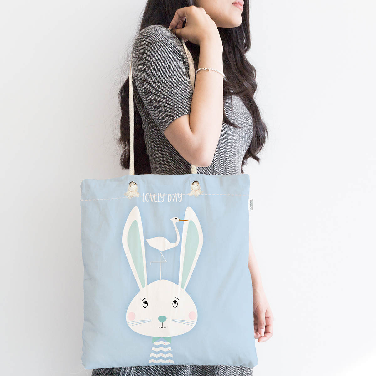 Mavi Zeminde Tavşan Ve Leylek Desenli Dijital Baskılı Çocuk Odası Kumaş Plaj Çantası Realhomes