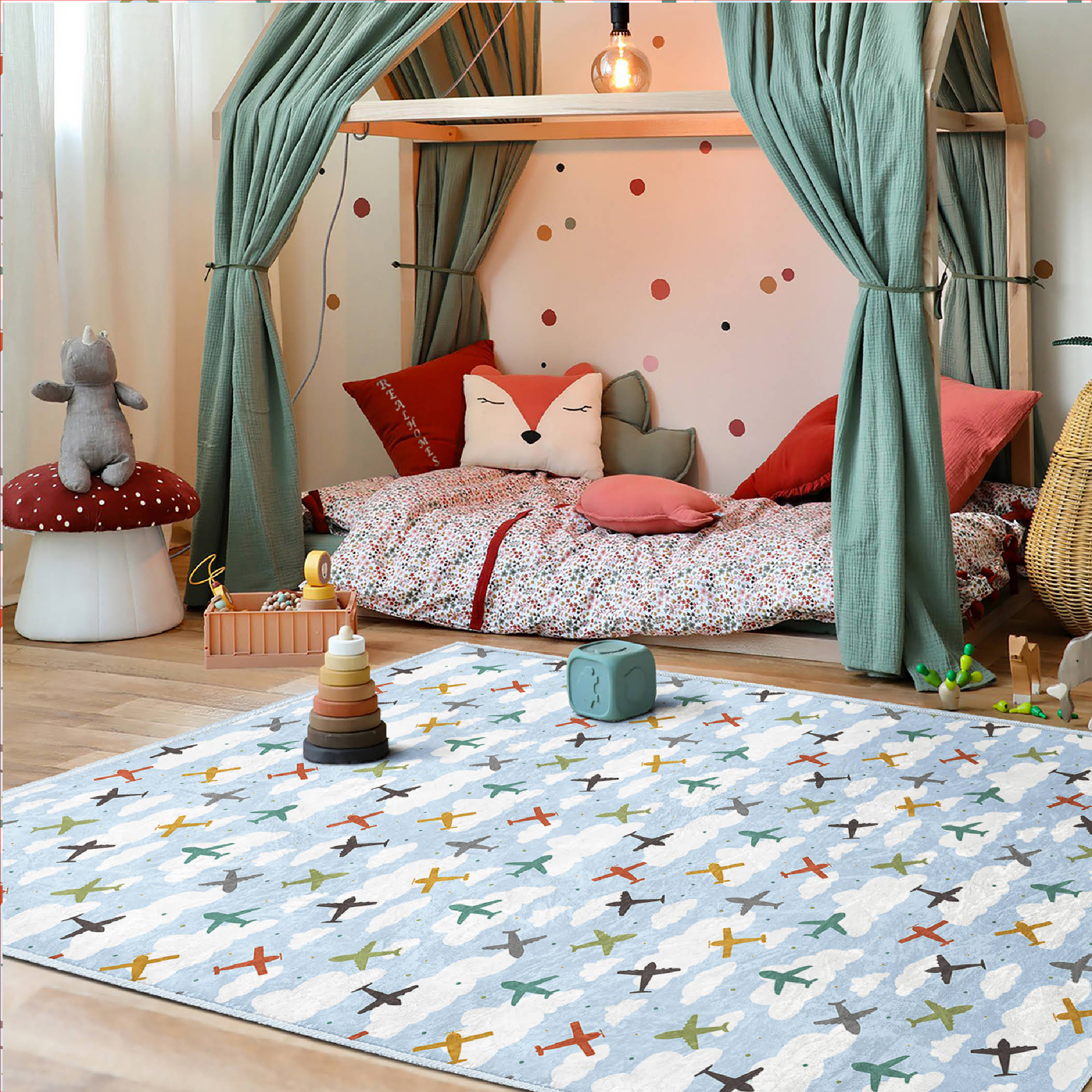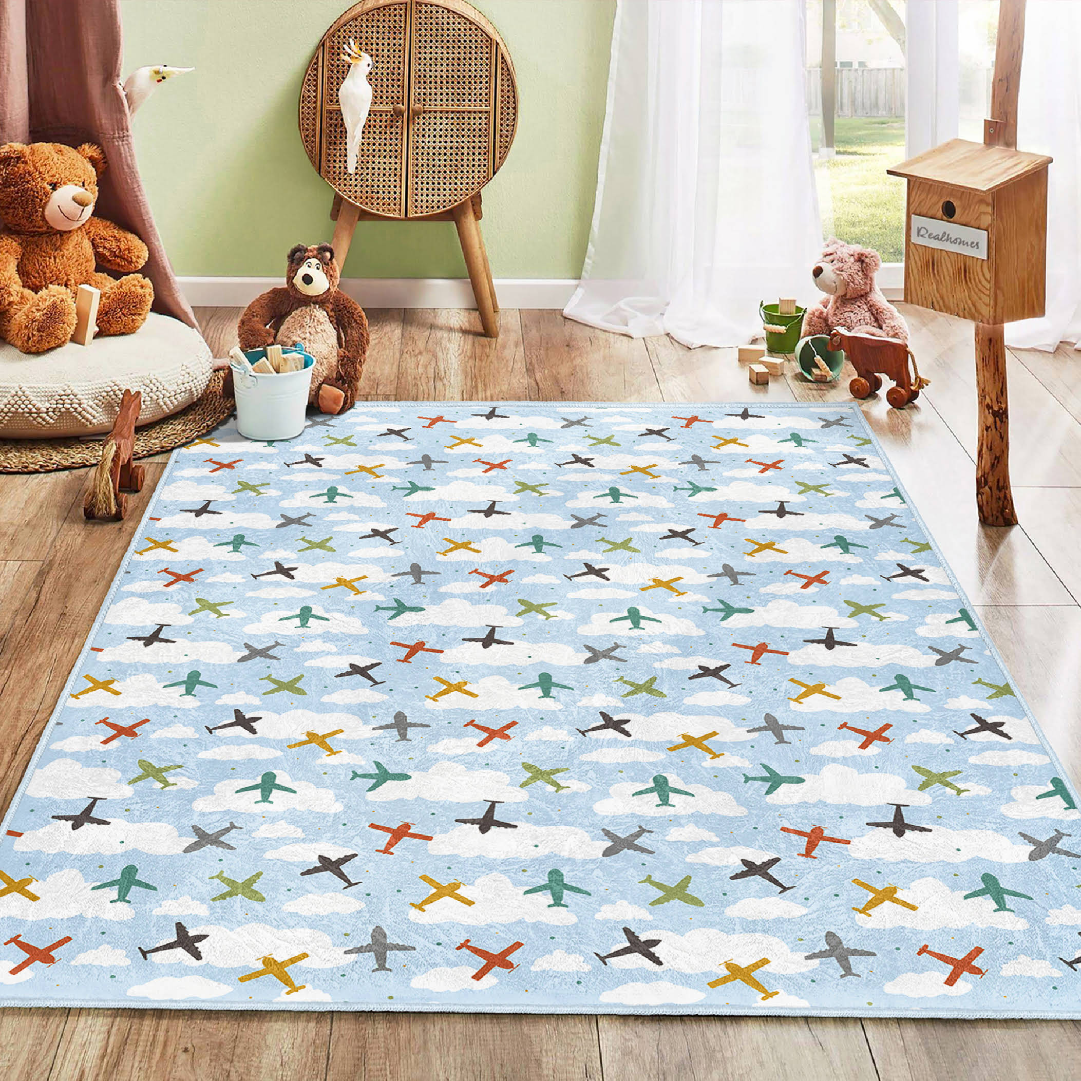 Mavi Zeminde Uçak Desenli Bulutlar Çocuk & Genç Odası Makinede Yıkanabilir Kaymaz Tabanlı Özel Ölçü Dekoratif Dikdörtgen Çocuk Odası Halısı