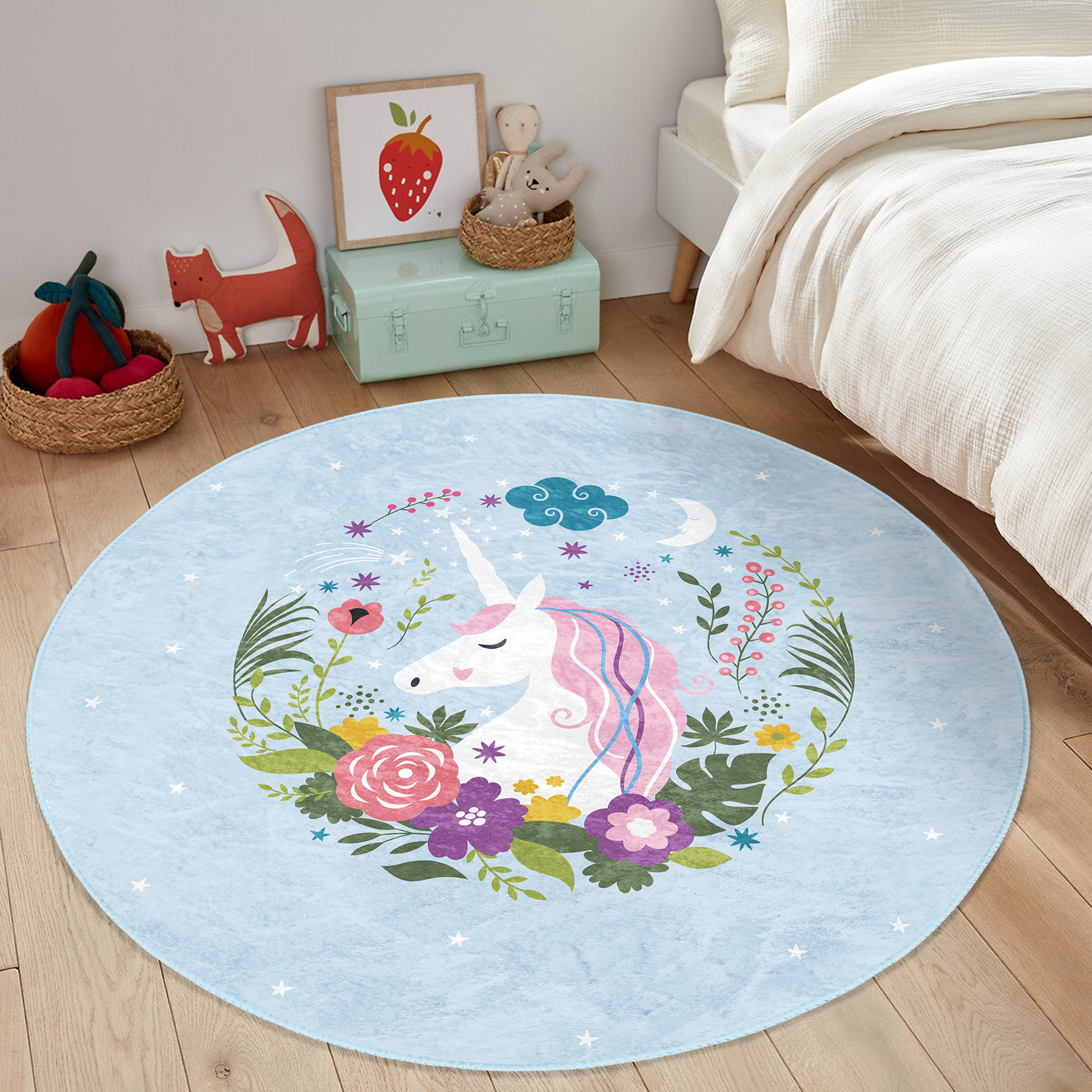 Mavi Zeminde Unicorn At Desenli Çocuk & Genç Odası Makinede Yıkanabilir Kaymaz Tabanlı Yuvarlak Çocuk Halısı