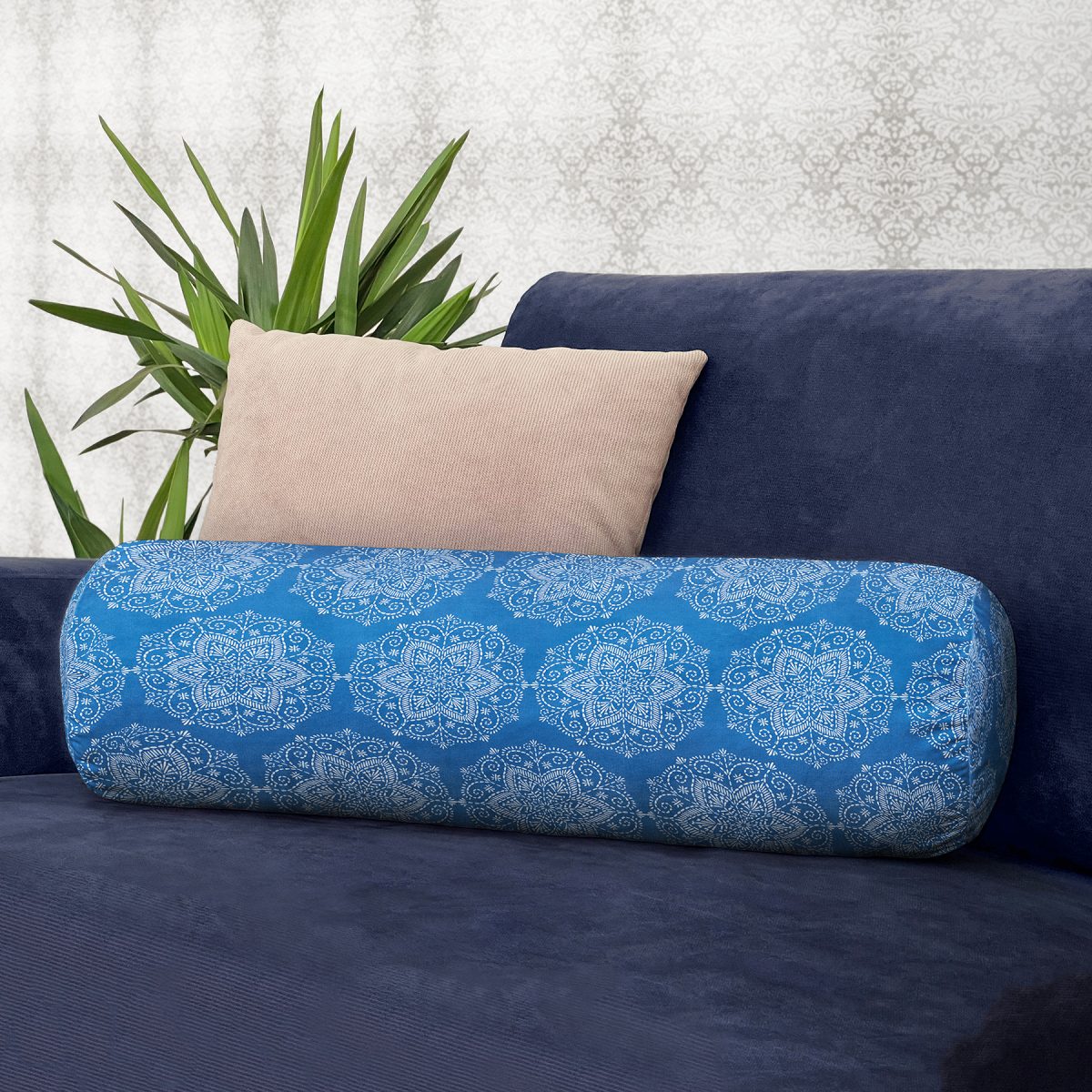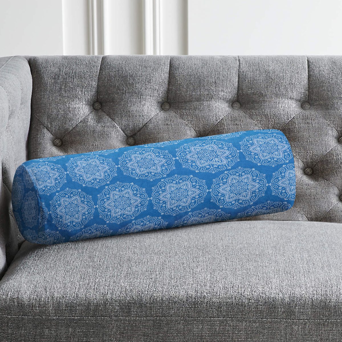Mavi Zeminli Kar tanesi Desenli Dijital Baskılı Modern İç Dolgulu Süet Silindir Yastık Kırlent – Bel Yastığı