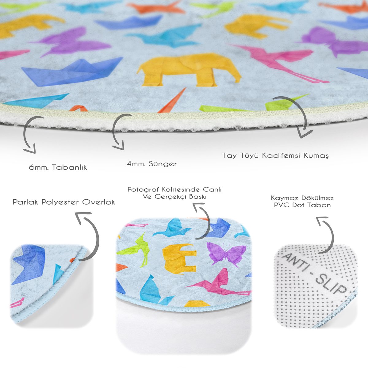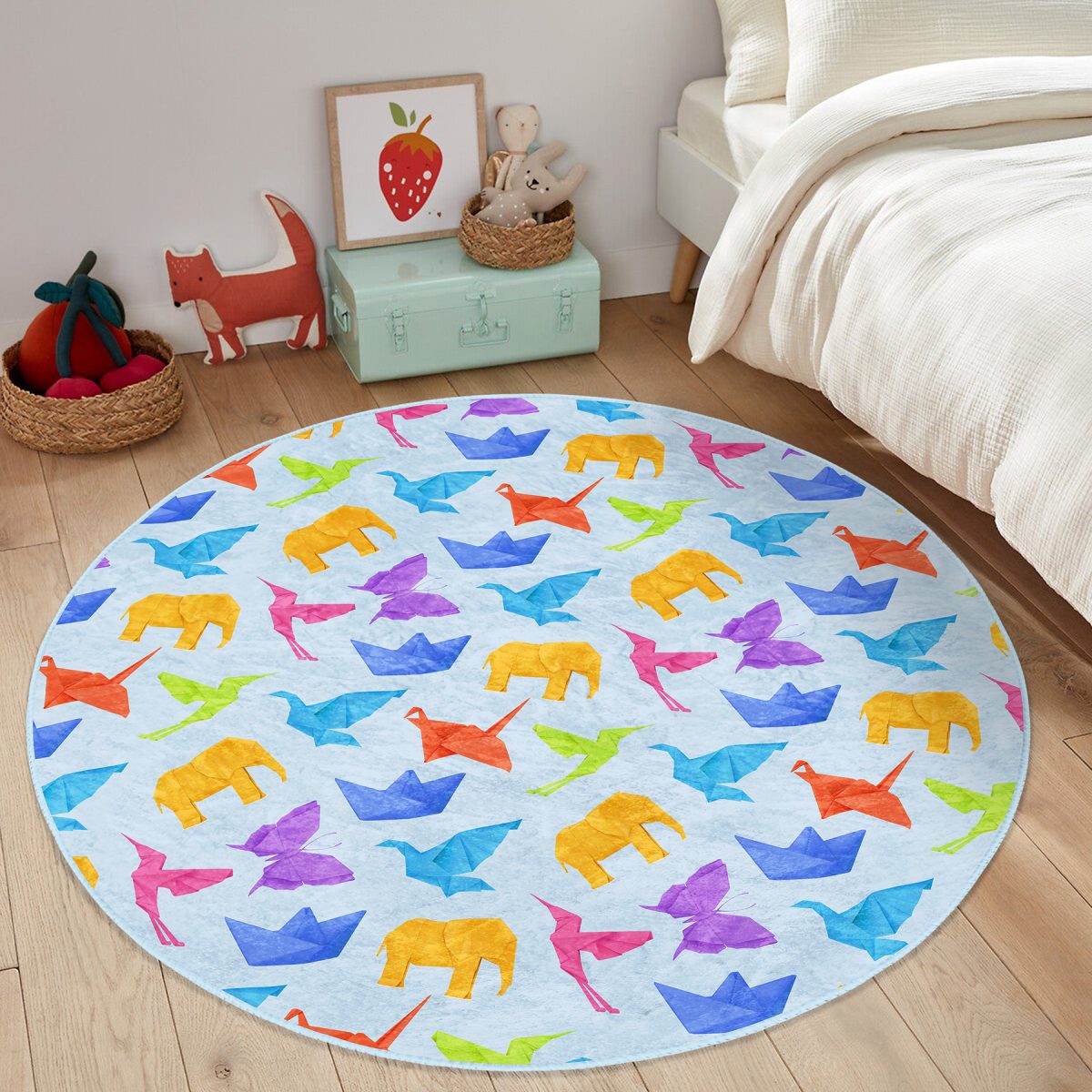 Mavi Zeminli Origami Sanatı Çocuk & Genç Odası Makinede Yıkanabilir Kaymaz Tabanlı Yuvarlak Çocuk Halısı