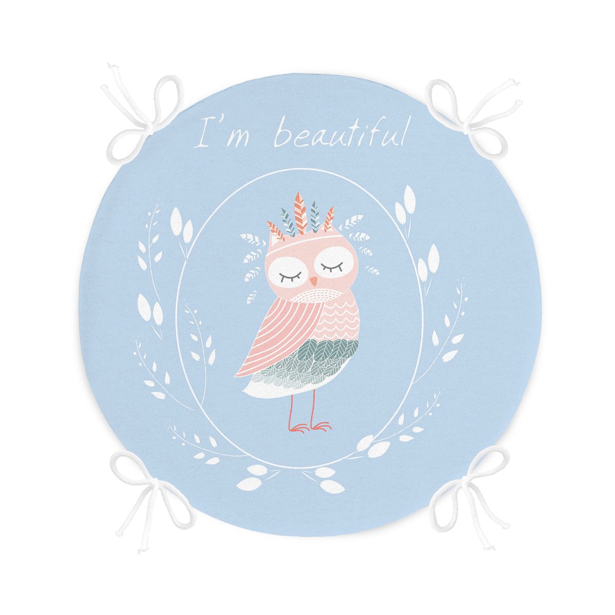 Mavi Zeminli Sevimli Baykuş Motifli Özel Tasarımlı Dijital Baskılı Çocuk Odası Yuvarlak Fermuarlı Sandalye Minderi