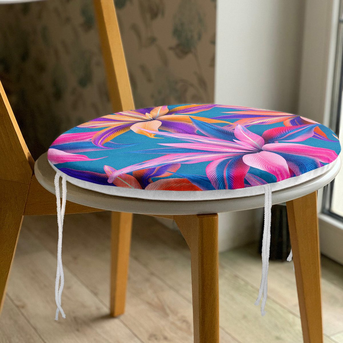 Mavi Zeminli Yapraklar Özel Tasarımlı Yuvarlak Fermuarlı Sandalye Minderi