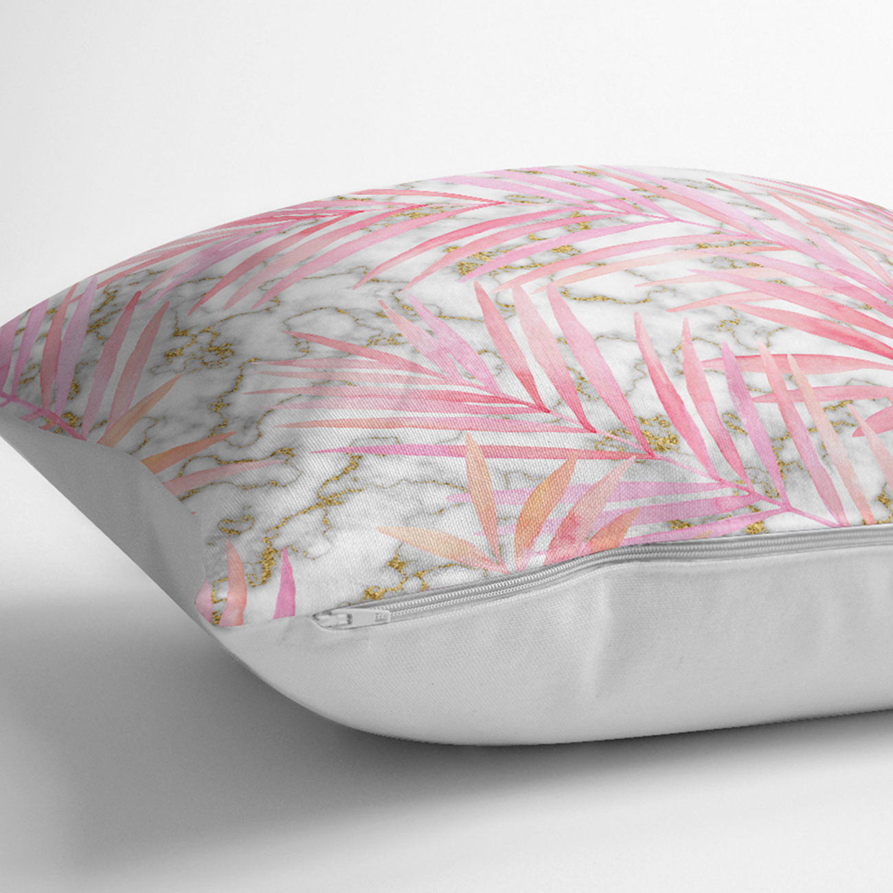 Mermer Zemin Üzerinde Gold Aytıntı Temalı Pembe Tropik Yaprak Desenli Kırlent Kılıfı Realhomes