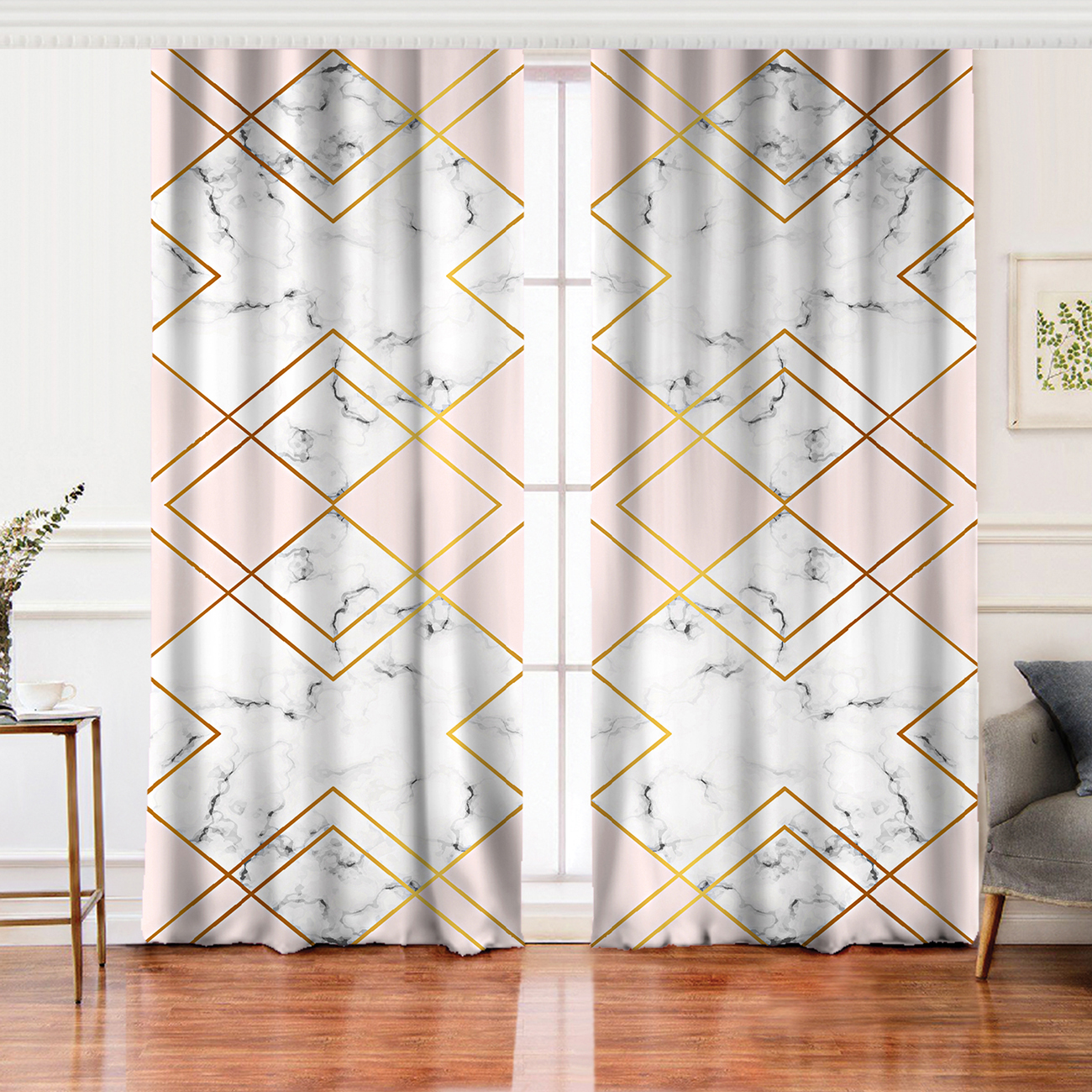 Mermer Zeminli Geometrik Detaylı Modern Salon Fon Perde