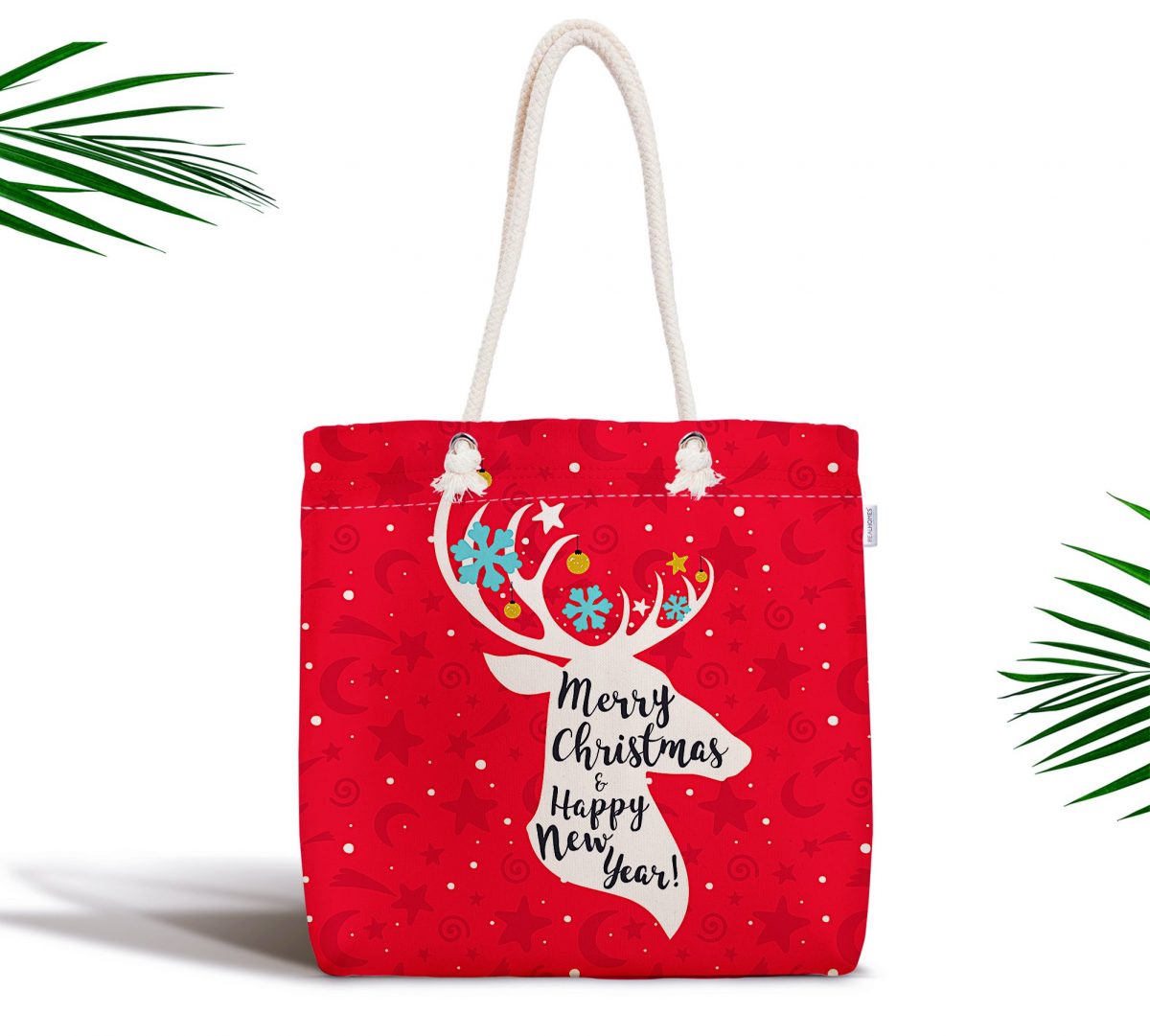 Merry Christmas Geyik Desenli Fermuarlı Modern Kumaş Çanta