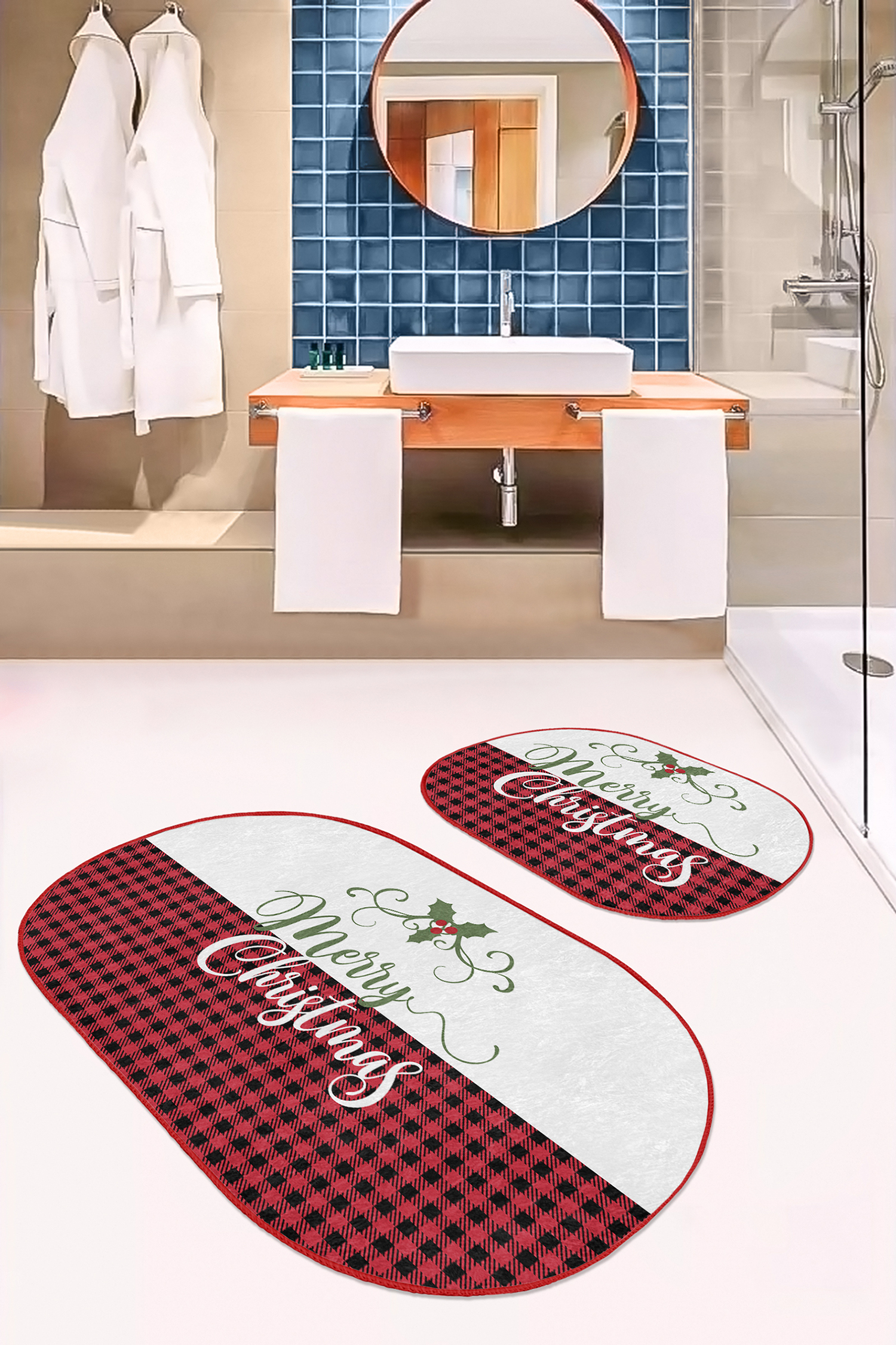 Mery Christmas Motifli 2'li Oval Kaymaz Tabanlı Banyo Paspas Takımı & Mutfak Paspas Seti Realhomes