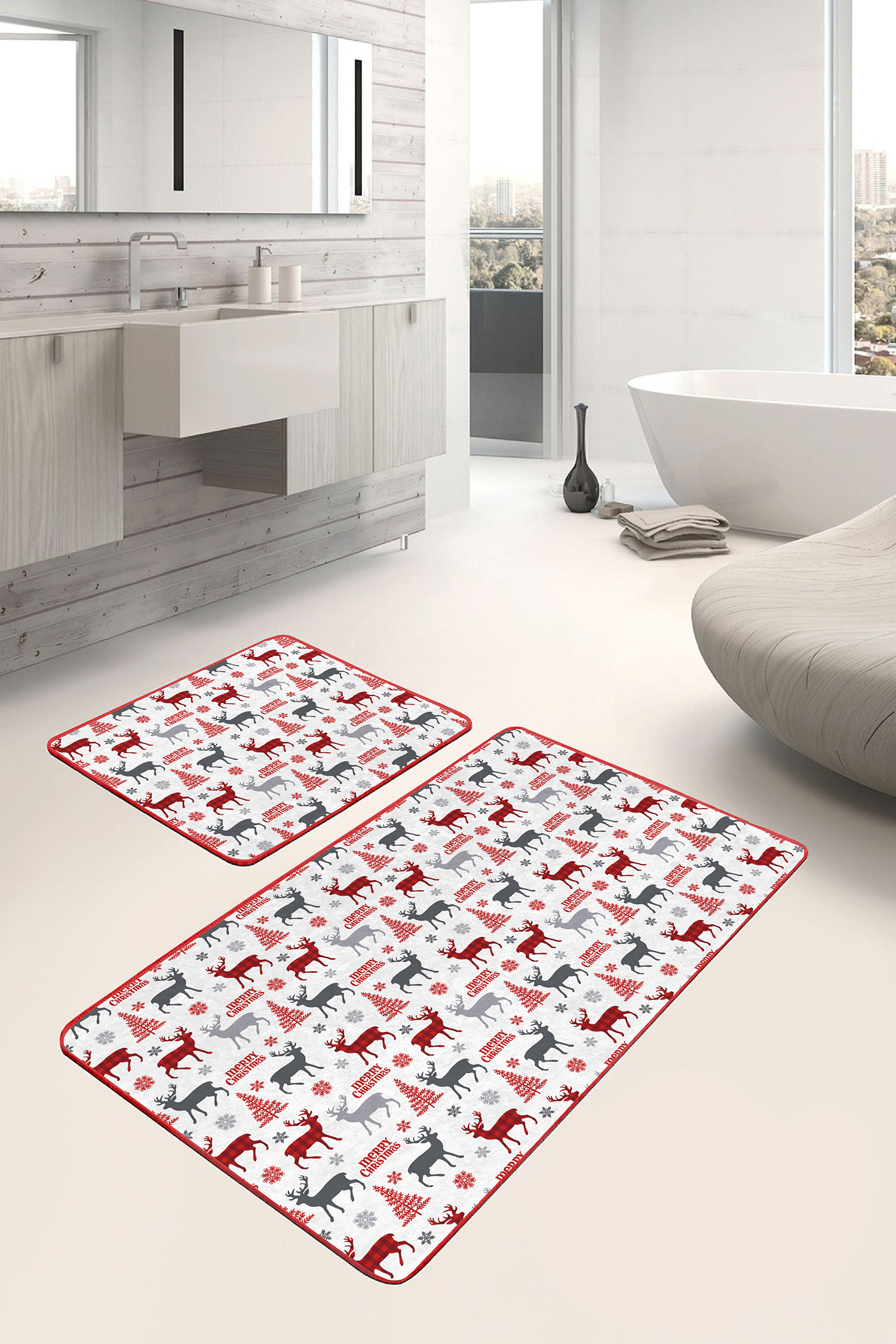 Mery Christmas Tasarımlı Dijital Baskılı 2'li Kaymaz Tabanlı Banyo & Mutfak Paspas Takımı Realhomes