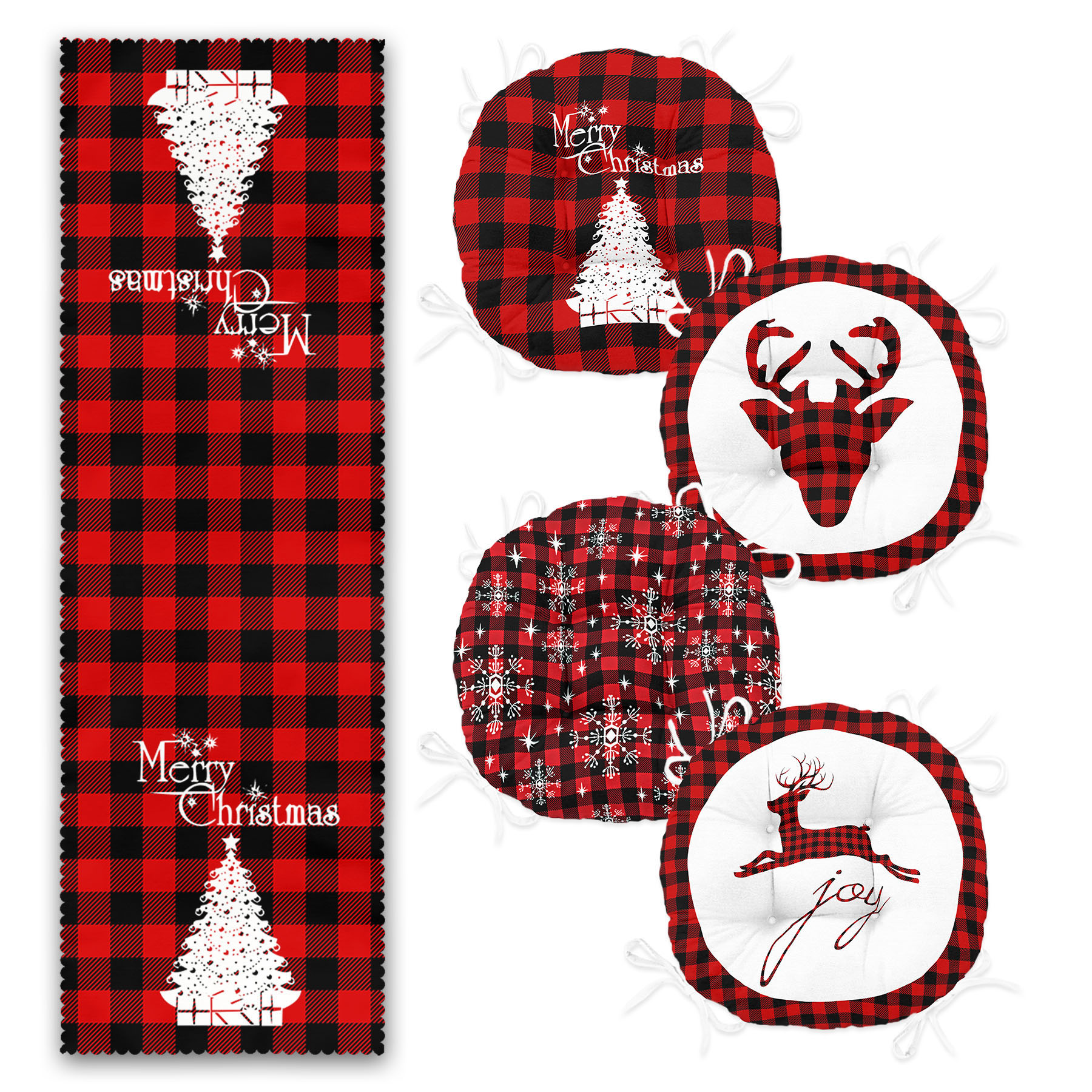 Mery Christmas Yılbaşı Tasarımlı 4 Yuvarlak Pofuduk Sandalye Minderi ve 1 Runner Seti Realhomes