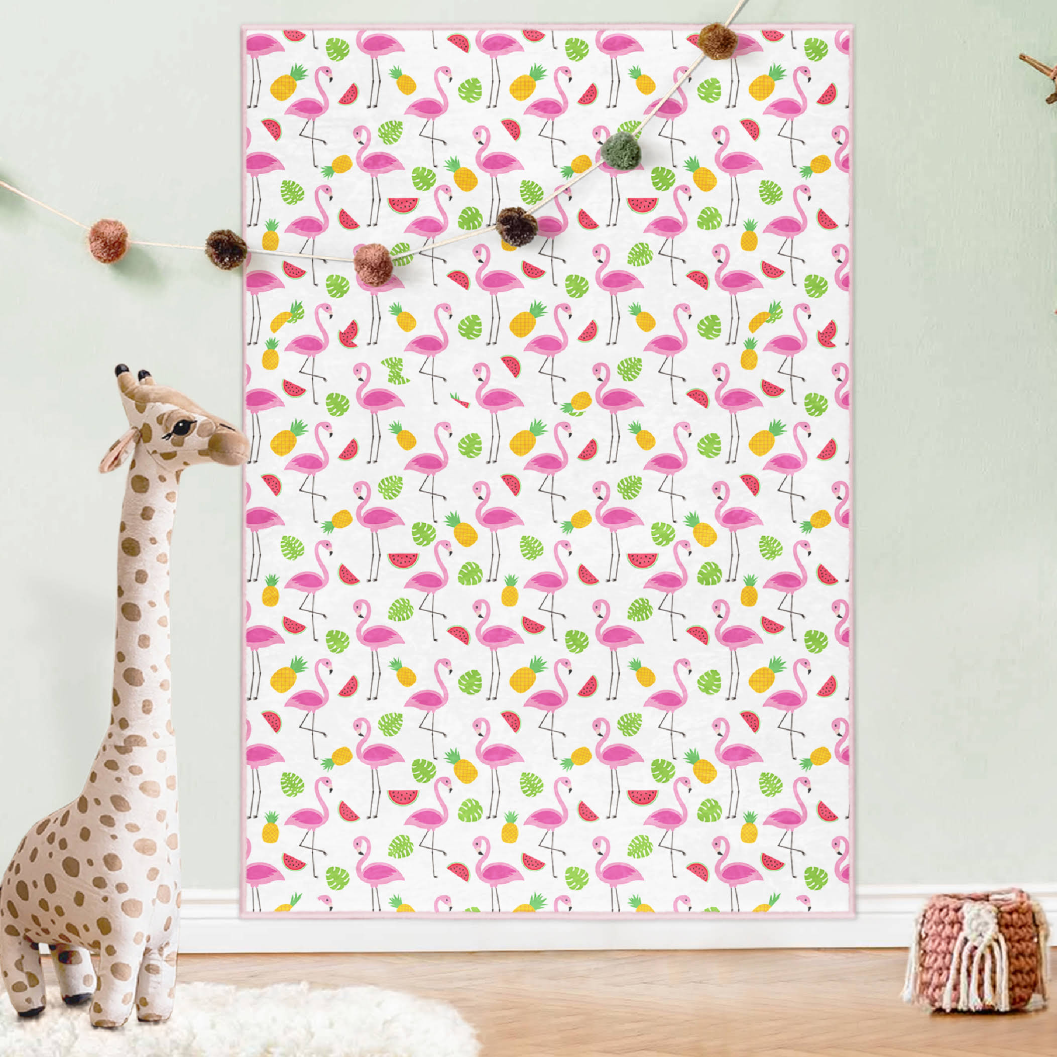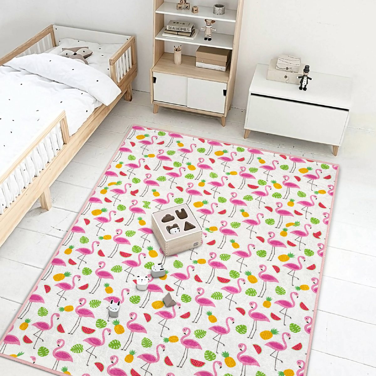 Meyve Çizimleri Arasında Flamingo Tasarımlı Çocuk & Genç Odası Makinede Yıkanabilir Kaymaz Tabanlı Dikdörtgen Çocuk Odası Halısı