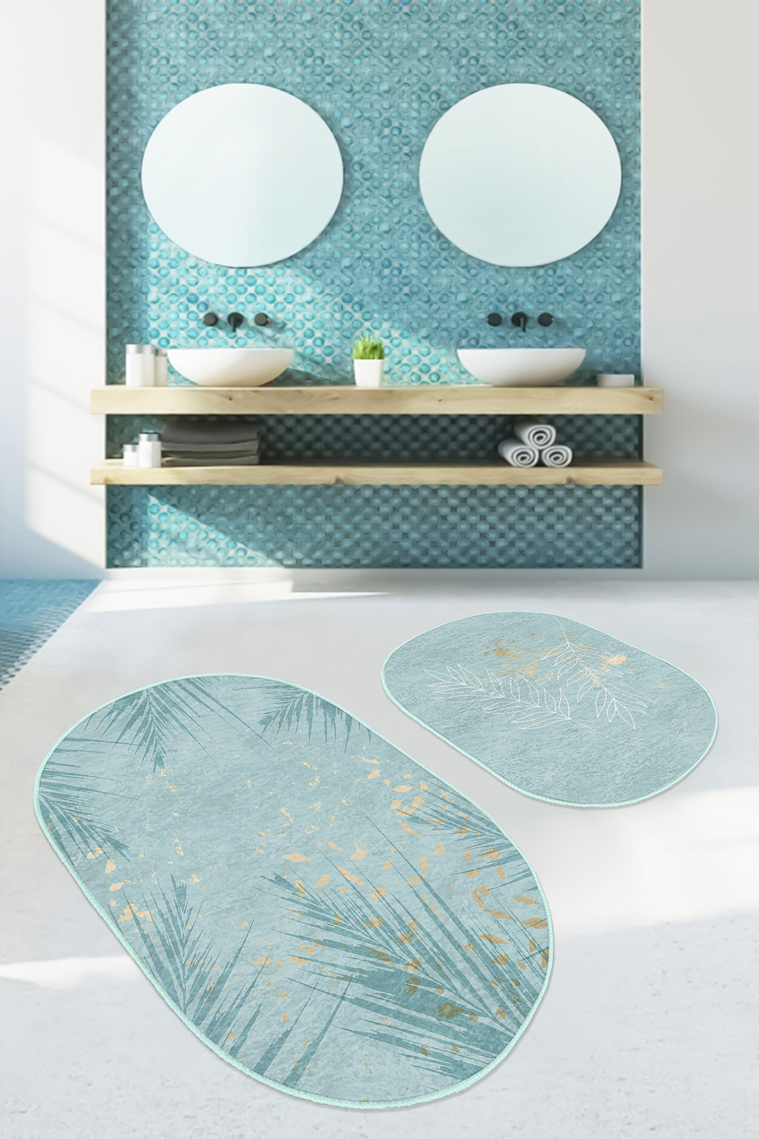 Mint Yeşili Temalı Yaprak Desenli 2’li Oval Kaymaz Tabanlı Banyo & Mutfak Paspas Takımı
