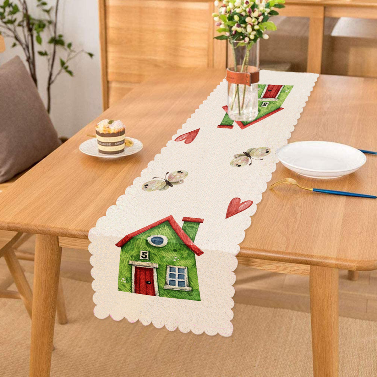 Minyatür Yeşil Ev Çizimli Dijital Baskılı Modern Runner