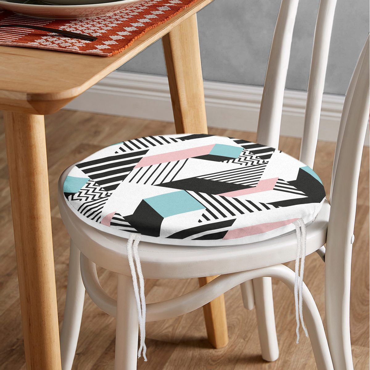 Modern Geometrik Şekilli Dijital Baskılı Yuvarlak Fermuarlı Sandalye Minderi