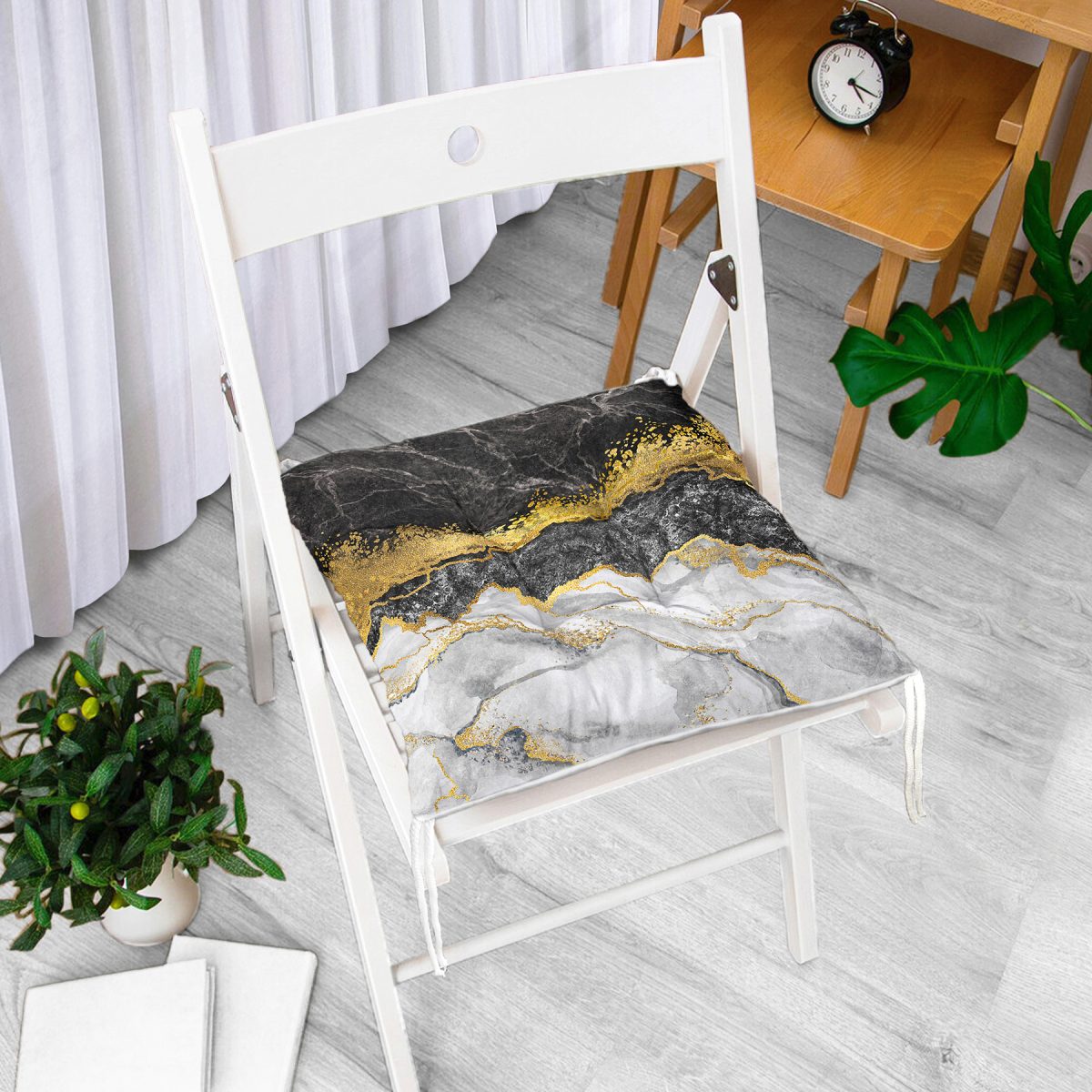 Modern Siyah Beyaz Altın Mermer Motifli Dijital Baskılı Pofuduk Sandalye Minderi