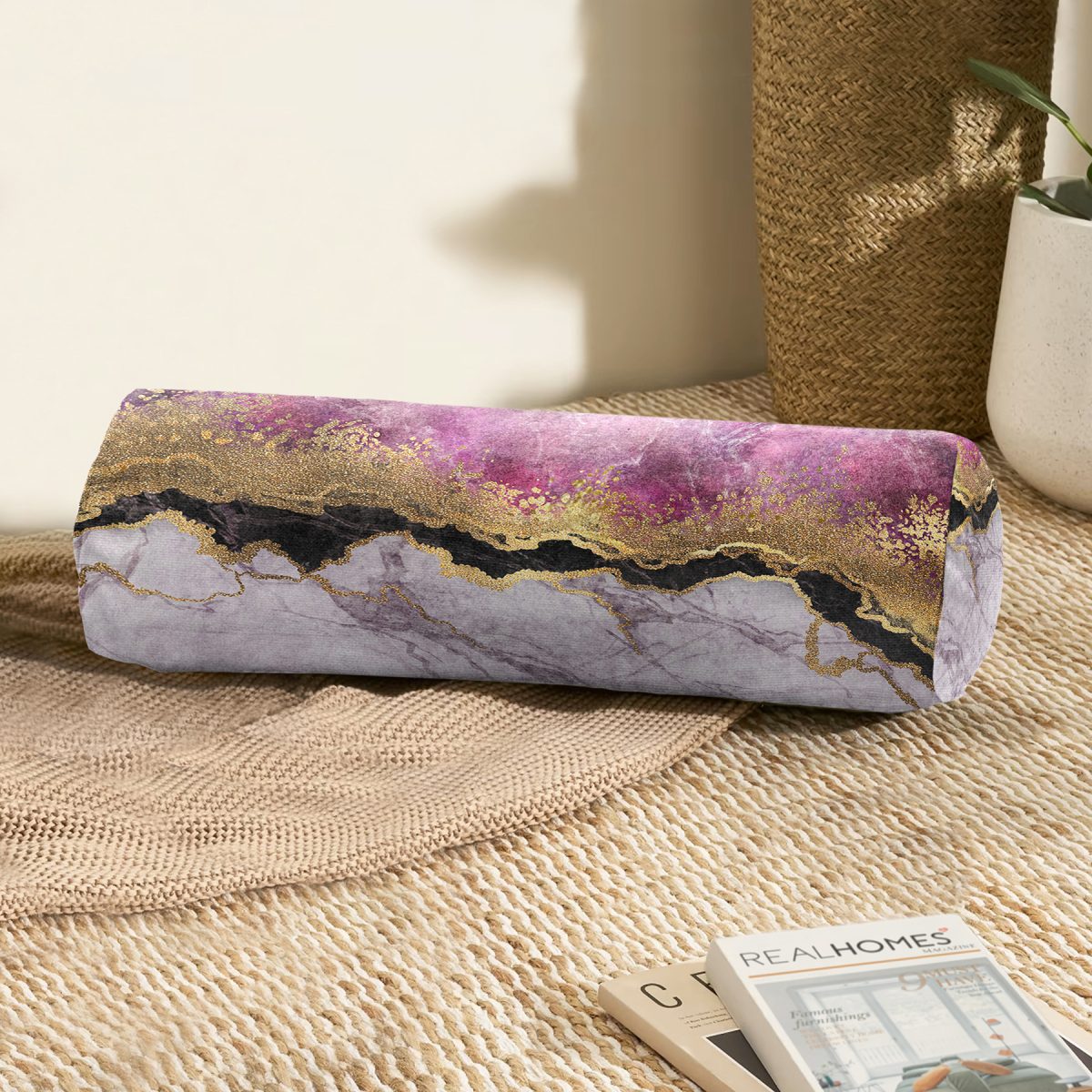 Mürdüm Beyaz Altın Desenli Modern İç Dolgulu – Fermuarlı Süet Silindir Daire Yastık Kırlent