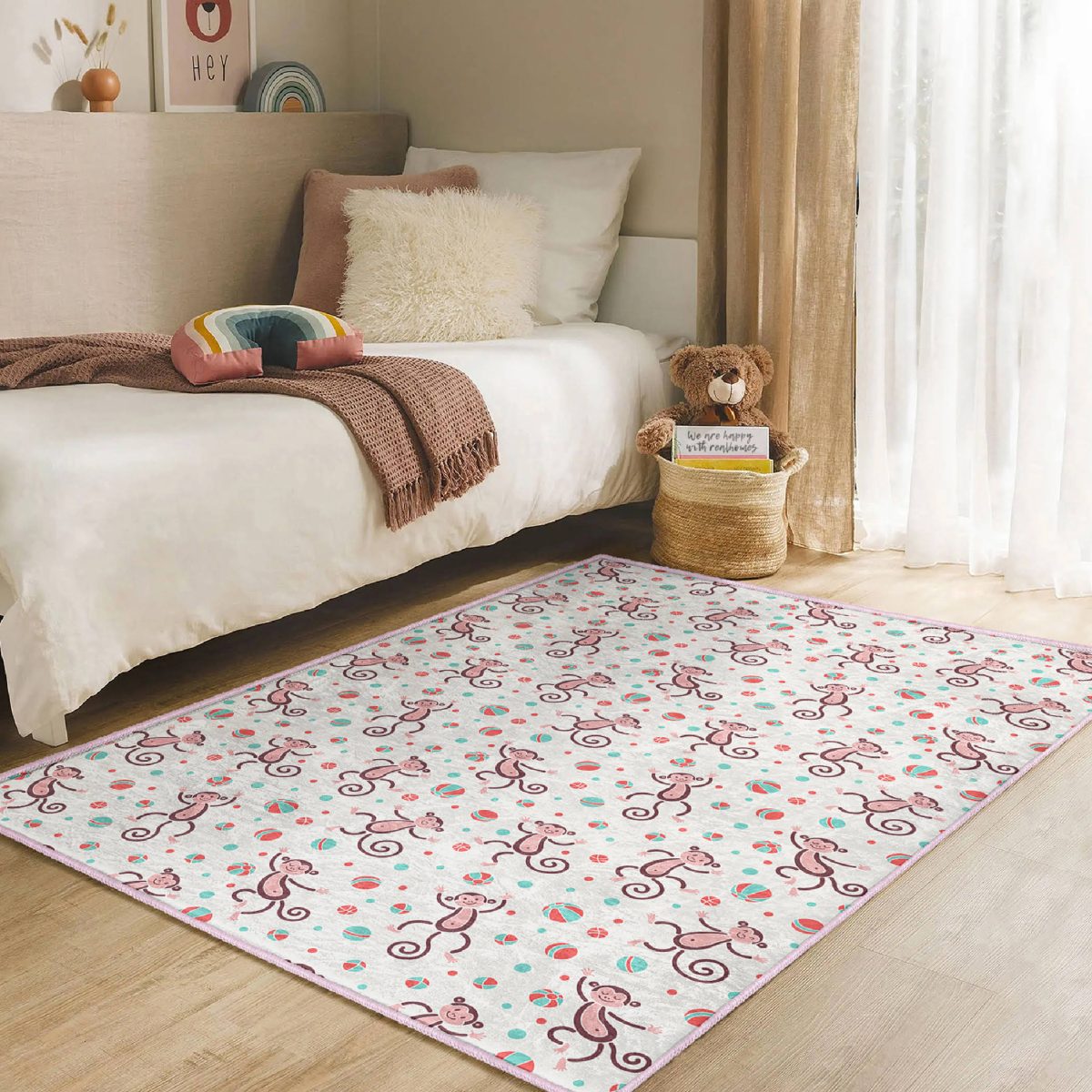 Neşeli Maymunlar Temalı Çocuk & Genç Odası Makinede Yıkanabilir Kaymaz Tabanlı Özel Ölçü Dekoratif Dikdörtgen Çocuk Odası Halısı