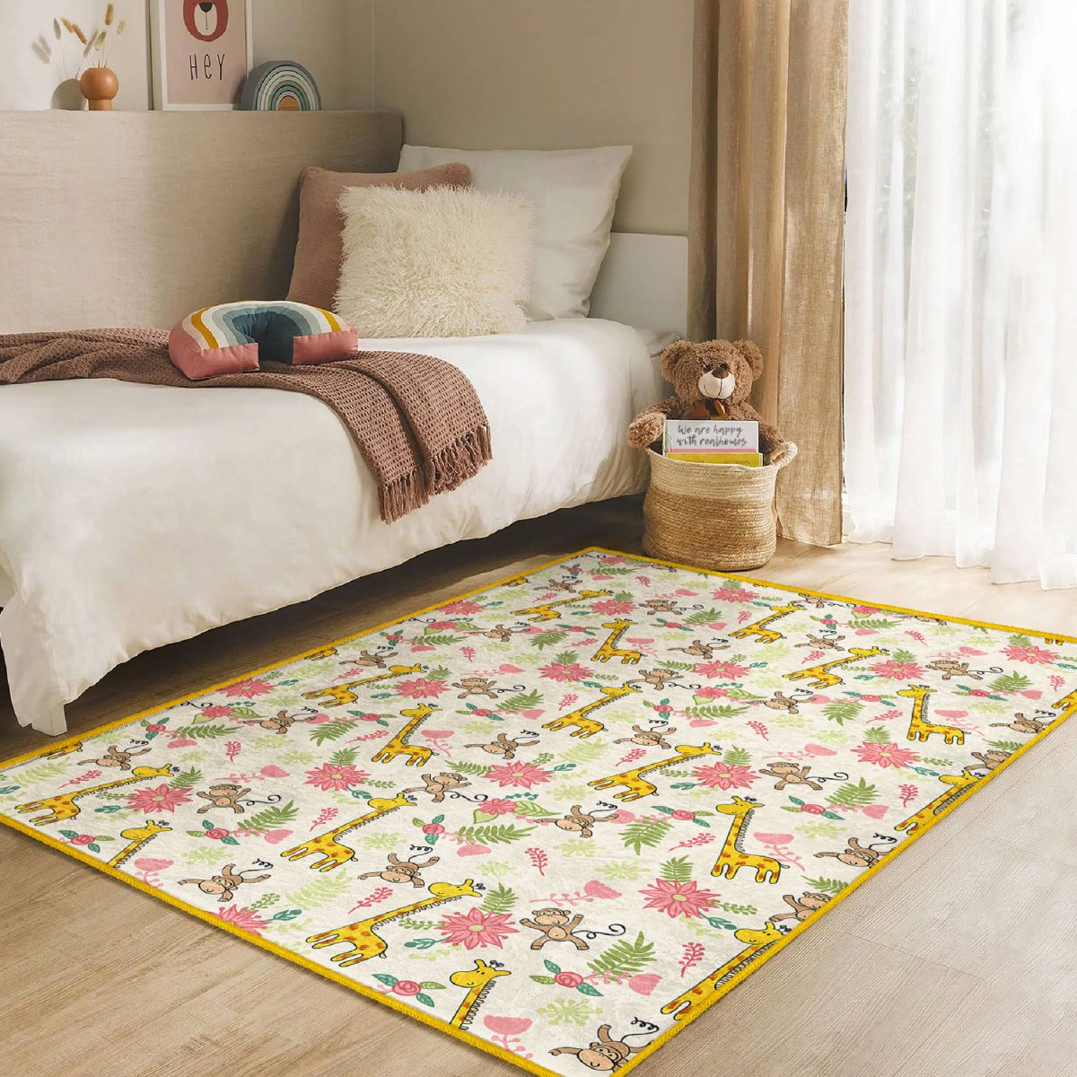 Orman Temalı Maymun Ve Zürafa Desenli Çocuk & Genç Odası Makinede Yıkanabilir Kaymaz Tabanlı Dekoratif Dikdörtgen & Kare Çocuk Halısı