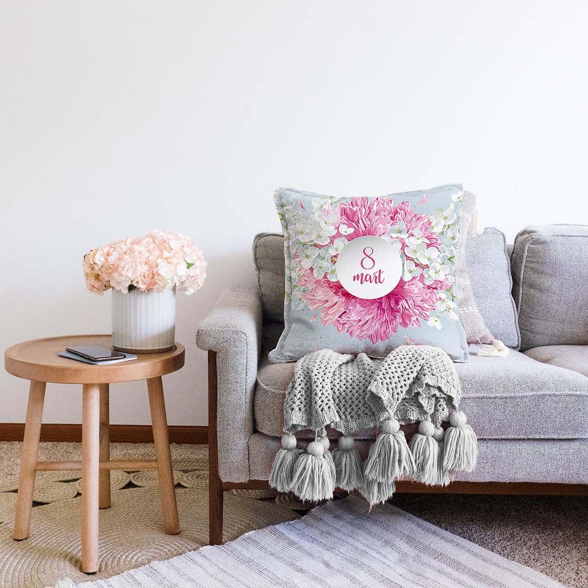 Özel Tasarım 8 Mart Ortanca Çiçeği Motifli Dijital Baskılı Modern Şönil Yastık Kırlent Kılıfı