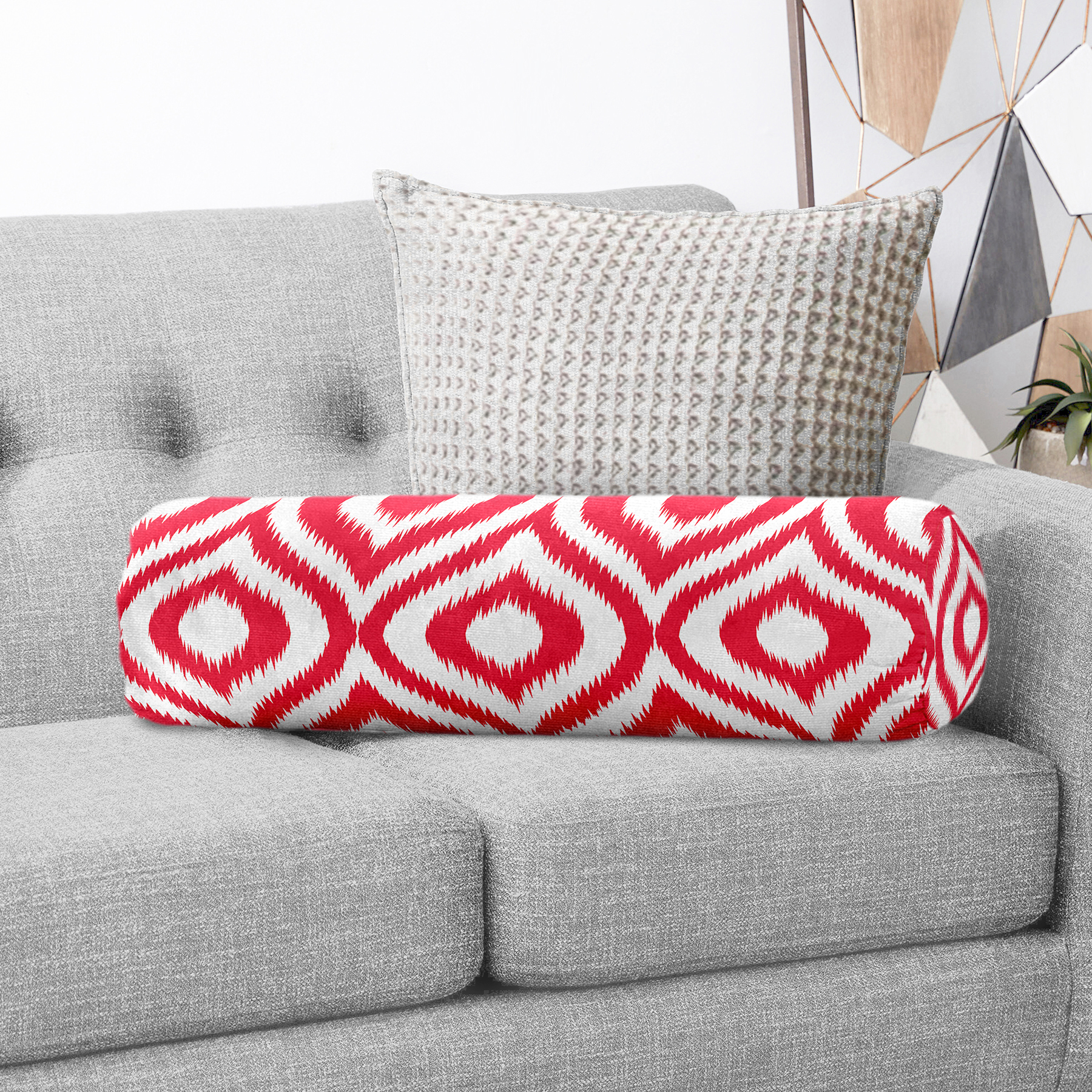 Özel Tasarım Kırmızı İkat Desenli Dijital Baskılı İç Dolgulu – Fermuarlı Süet Berjer Silindir Yastık Kırlent