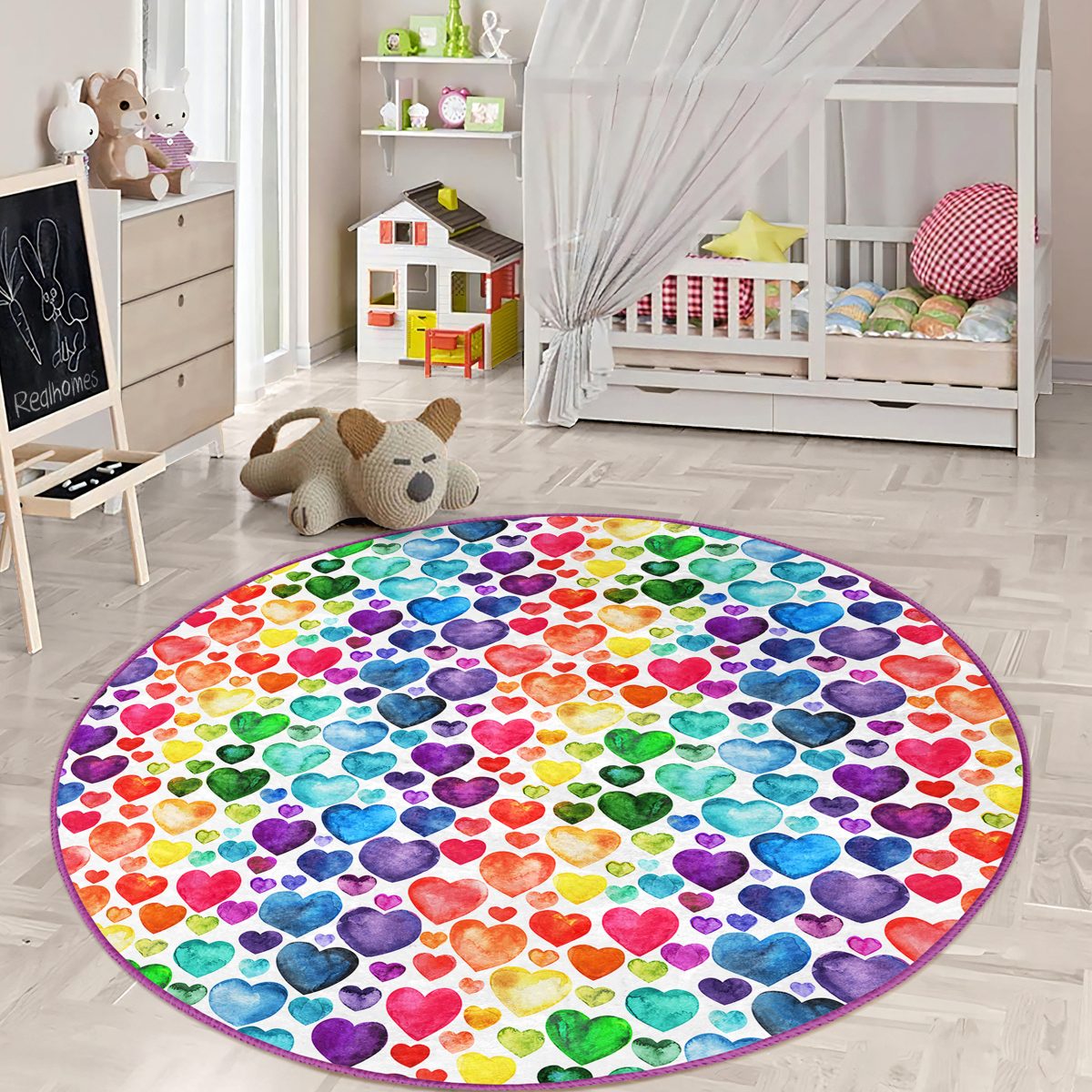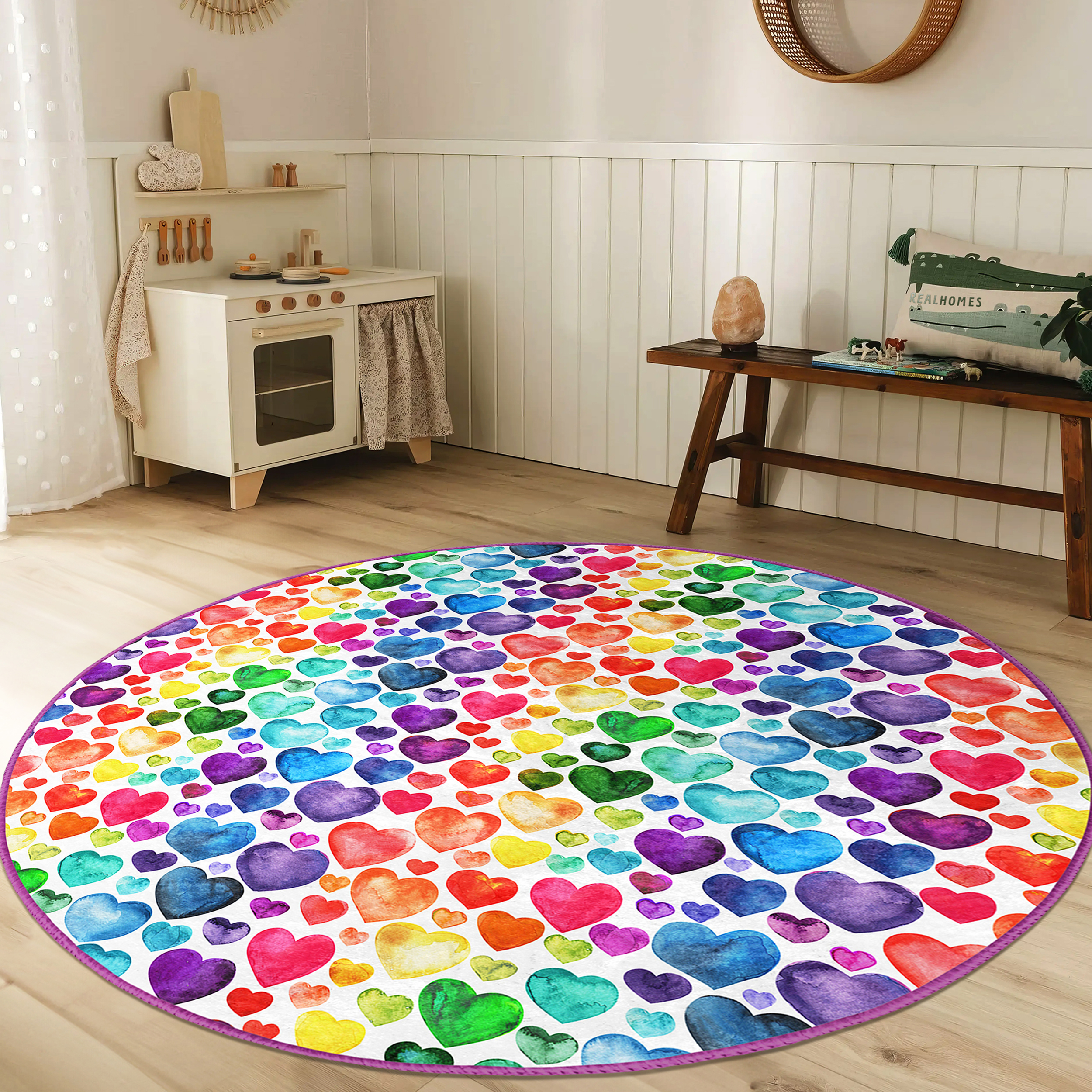 Özel Tasarım Renkli Kalpler Çocuk & Genç Odası Makinede Yıkanabilir Kaymaz Tabanlı Yuvarlak Çocuk Halısı