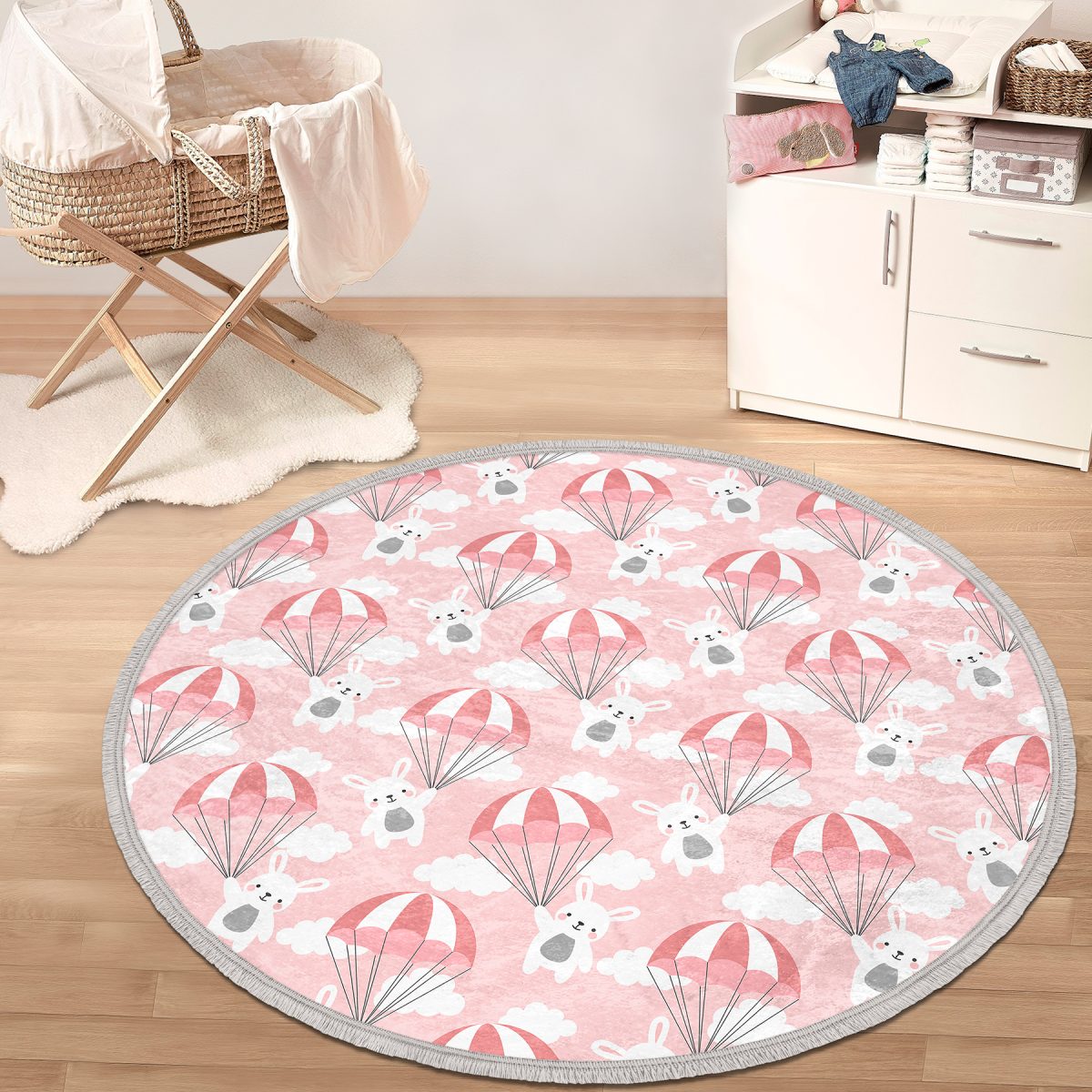Paraşütlü Tavşan Motifli Çocuk & Genç Odası Makinede Yıkanabilir Kaymaz Tabanlı Püsküllü Yuvarlak Çocuk Halısı