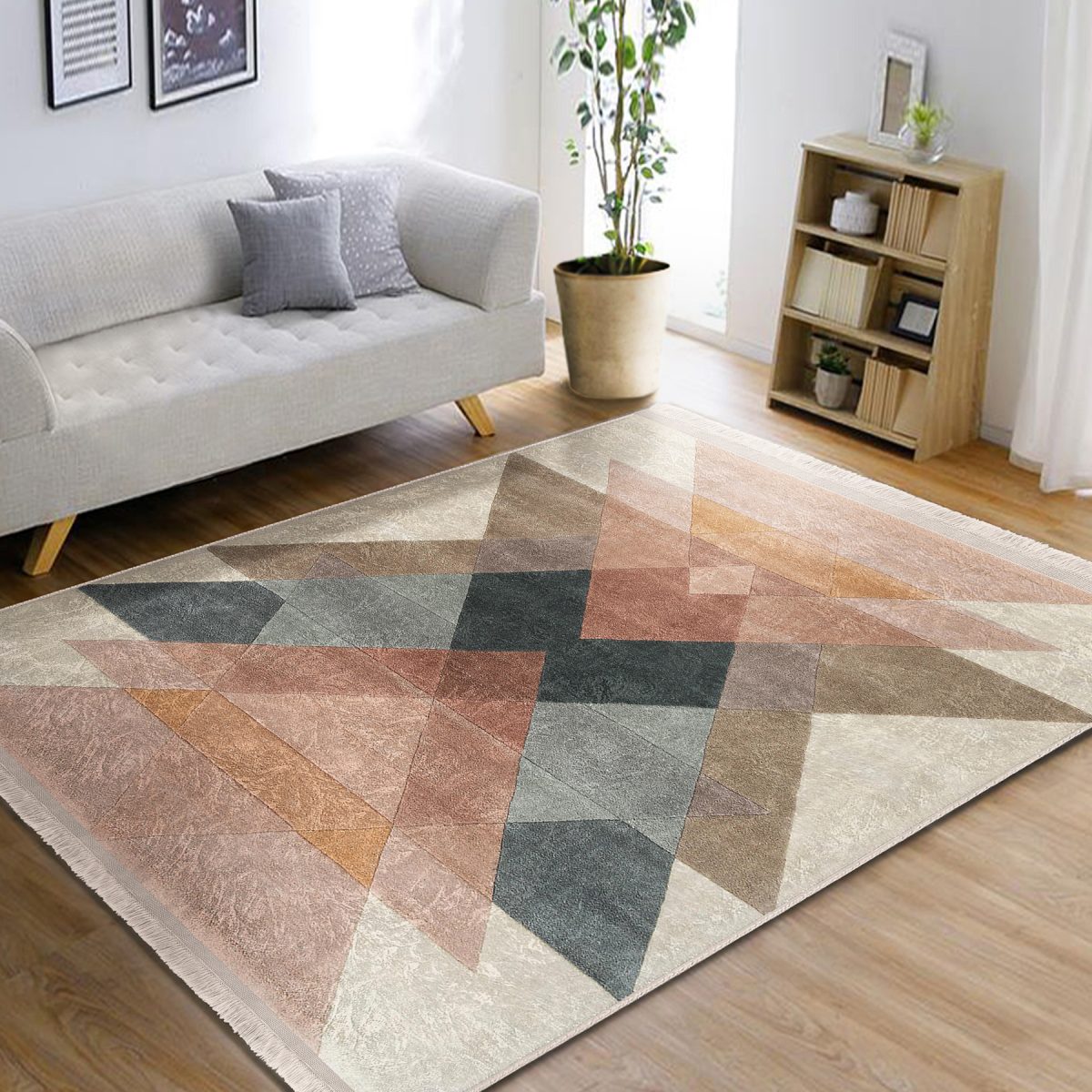 Pastel Renkli Zeminde Geometrik Motifli Üçgen Desenli Geometrik Sade & Şık Balkon Salon & Oturma Odası Dijital Baskılı Makinede Yıkanabilir Kaymaz Taban Saçaklı Halı