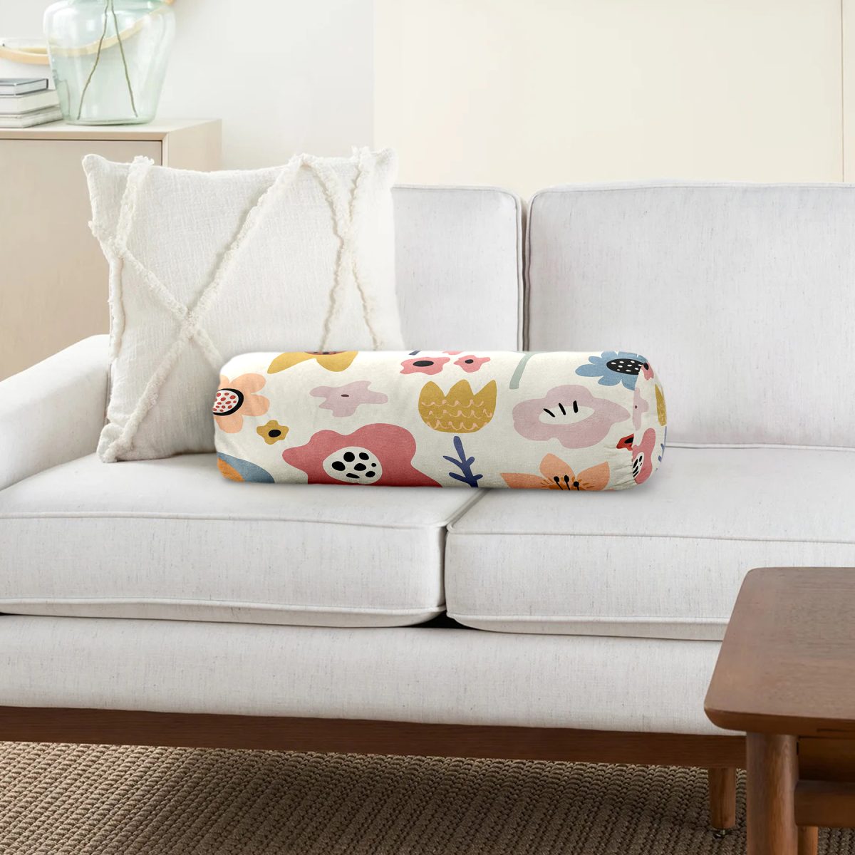 Pastel Zemin Üzerinde Çiçek Desenli Dijital Baskılı Modern İç Dolgulu Süet Silindir Yastık Kırlent – Bel Yastığı