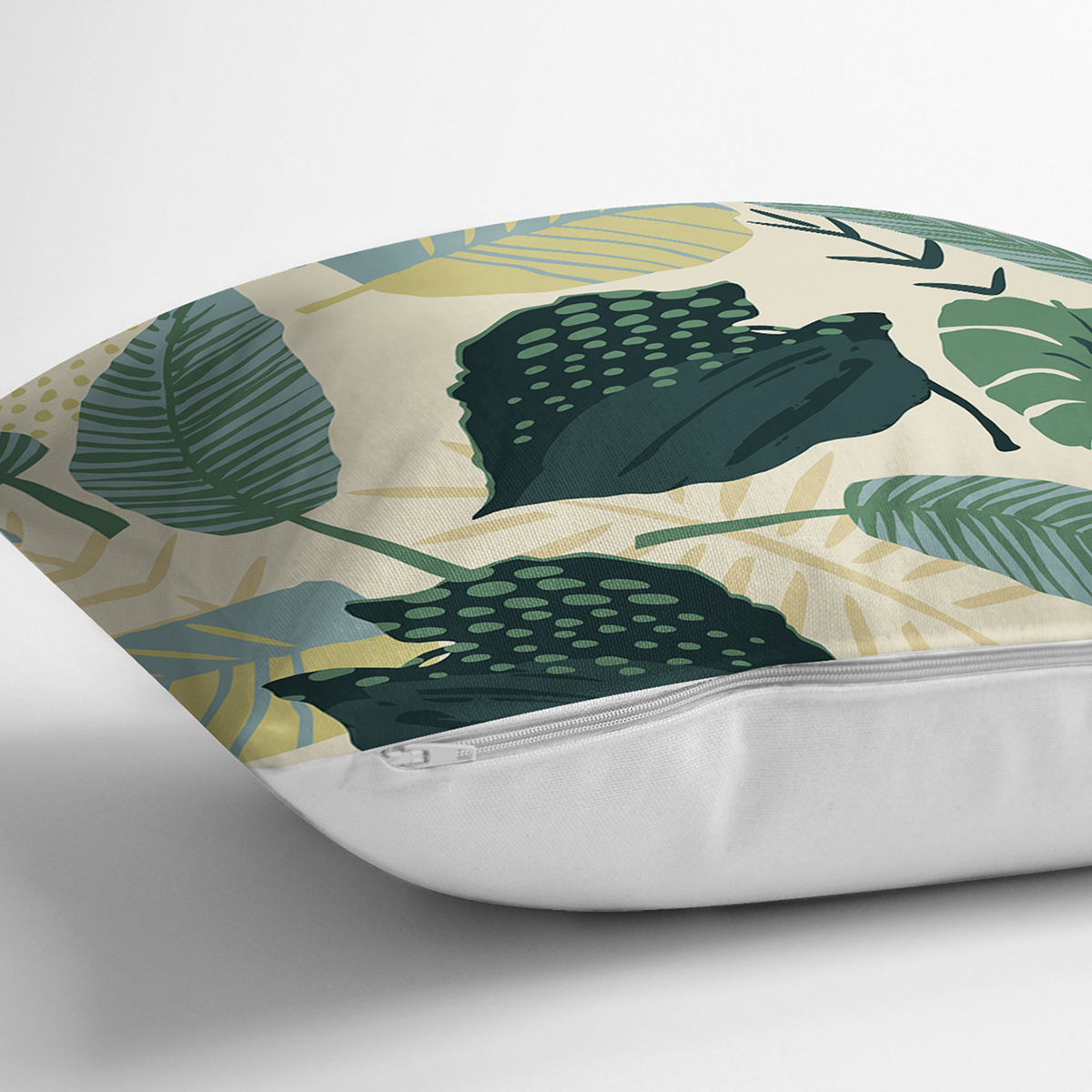 Pastel Zeminli Yeşil Yaprak Desenli Dijital Baskılı Modern Yastık Kırlent Kılıfı