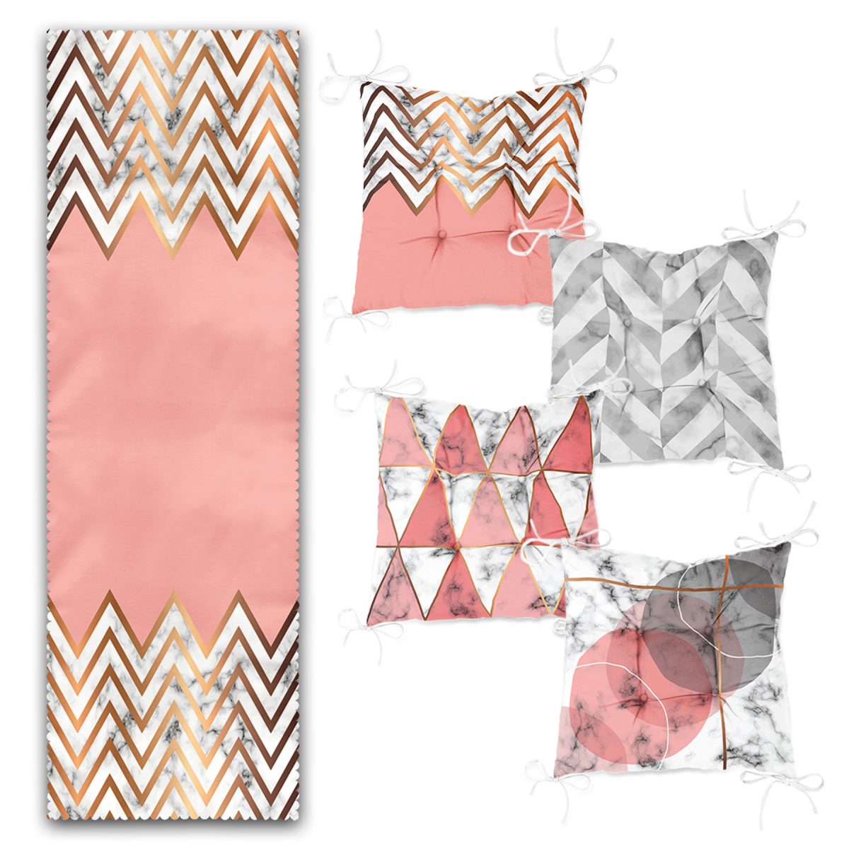 Pembe & Altın Varaklı Motifler Çizimli 4 Pofuduk Sandalye Minderi ve 1 Runner Seti