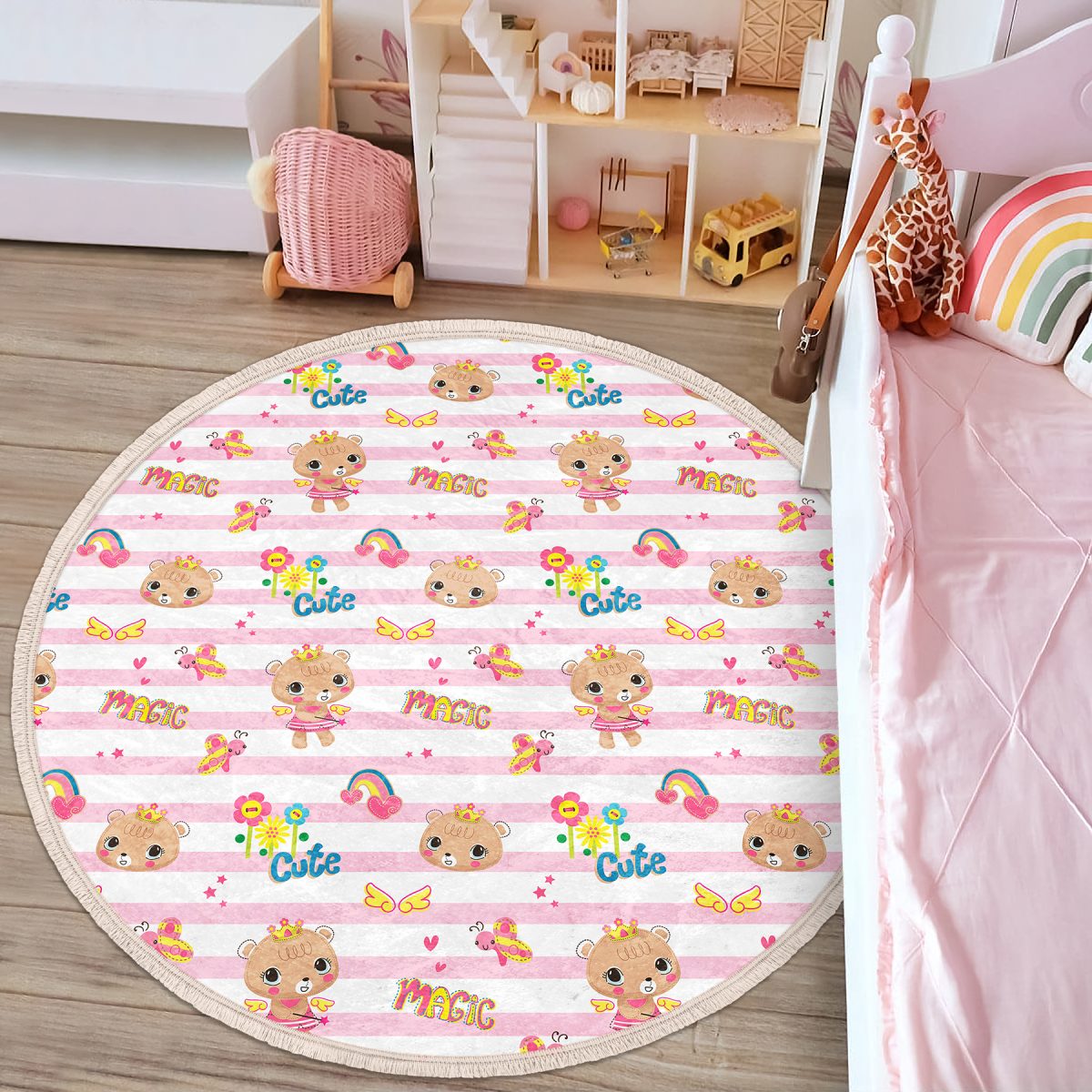 Pembe Çizgili Zeminde Şirin Ayıcık Temalı Çocuk & Genç Odası Makinede Yıkanabilir Kaymaz Tabanlı Püsküllü Yuvarlak Çocuk Halısı
