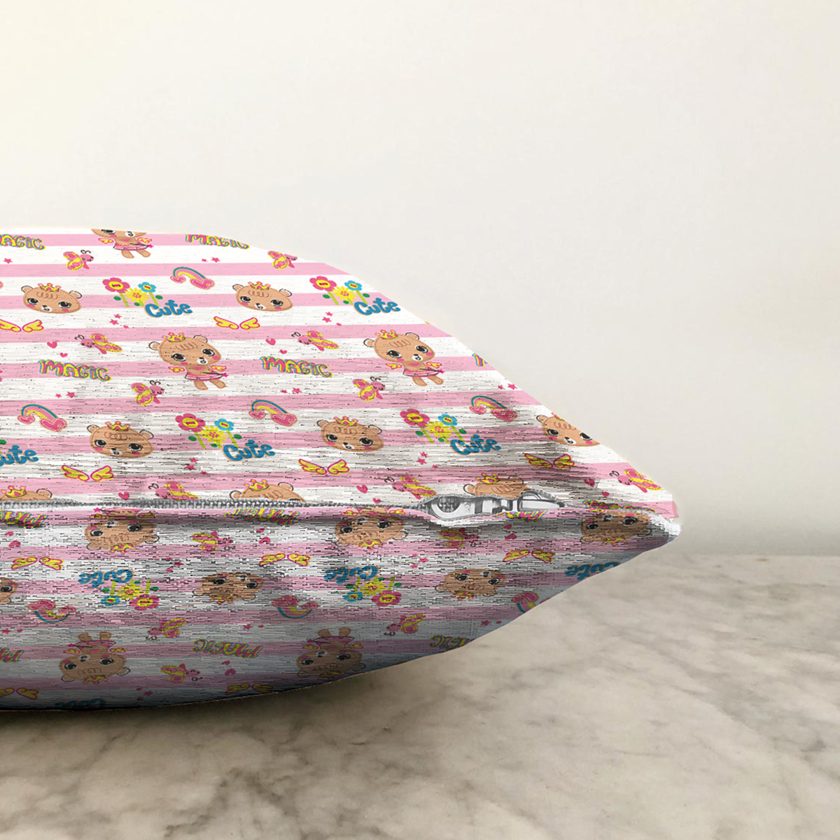 Pembe Çizgili Zeminde Şirin Ayıcık Temalı Dijital Baskılı Özel Tasarım Modern Raşel Kadife Yastık Kırlent Kılıfı