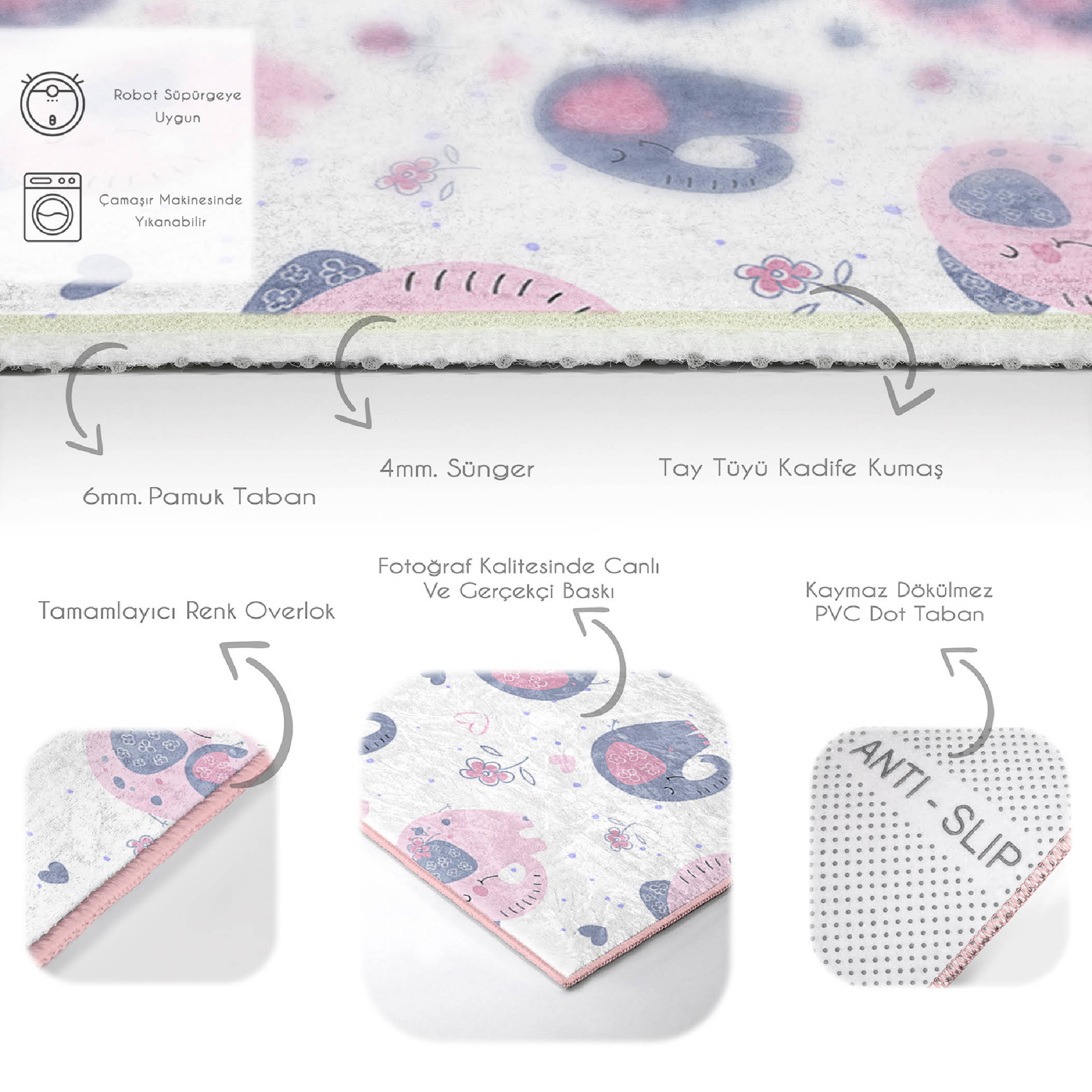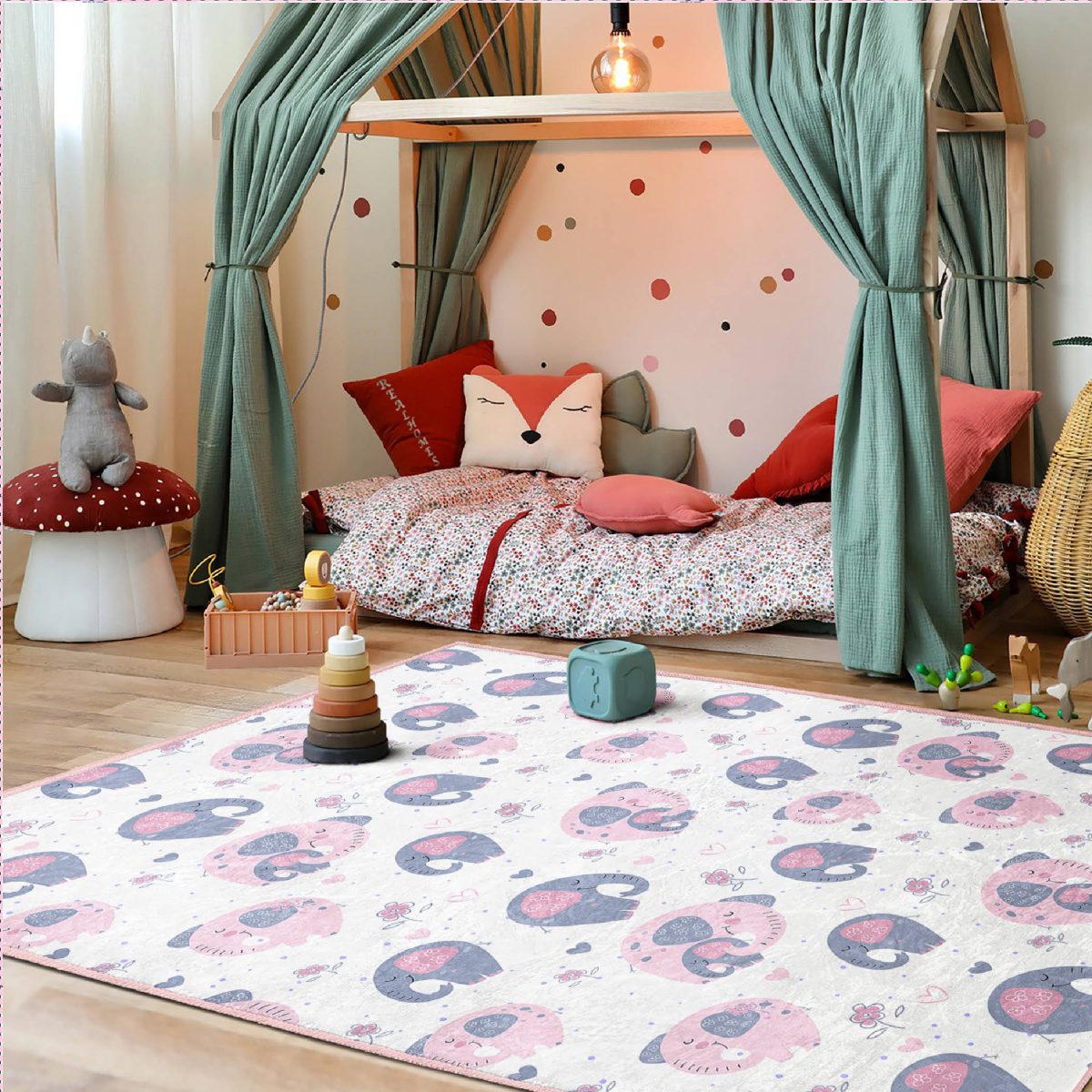 Pembe Fil Motifli Çocuk & Genç Odası Makinede Yıkanabilir Kaymaz Tabanlı Dikdörtgen Pamuk Tabanlı Özel Ölçü Çocuk Halısı