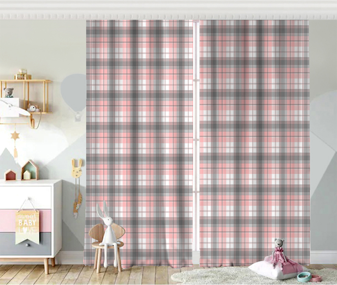 Pembe Gri Ekose Desenli Bebek Odası Fon Perde