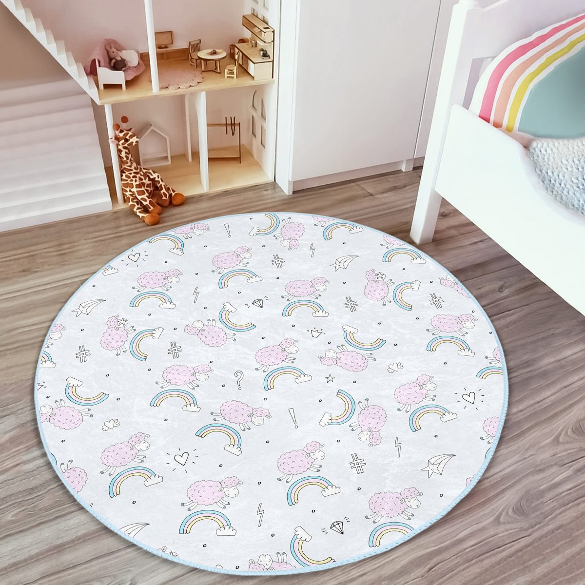Pembe Koyunlar Ve Gökkuşağı Desenli Çocuk & Genç Odası Makinede Yıkanabilir Kaymaz Tabanlı Yuvarlak Çocuk Halısı