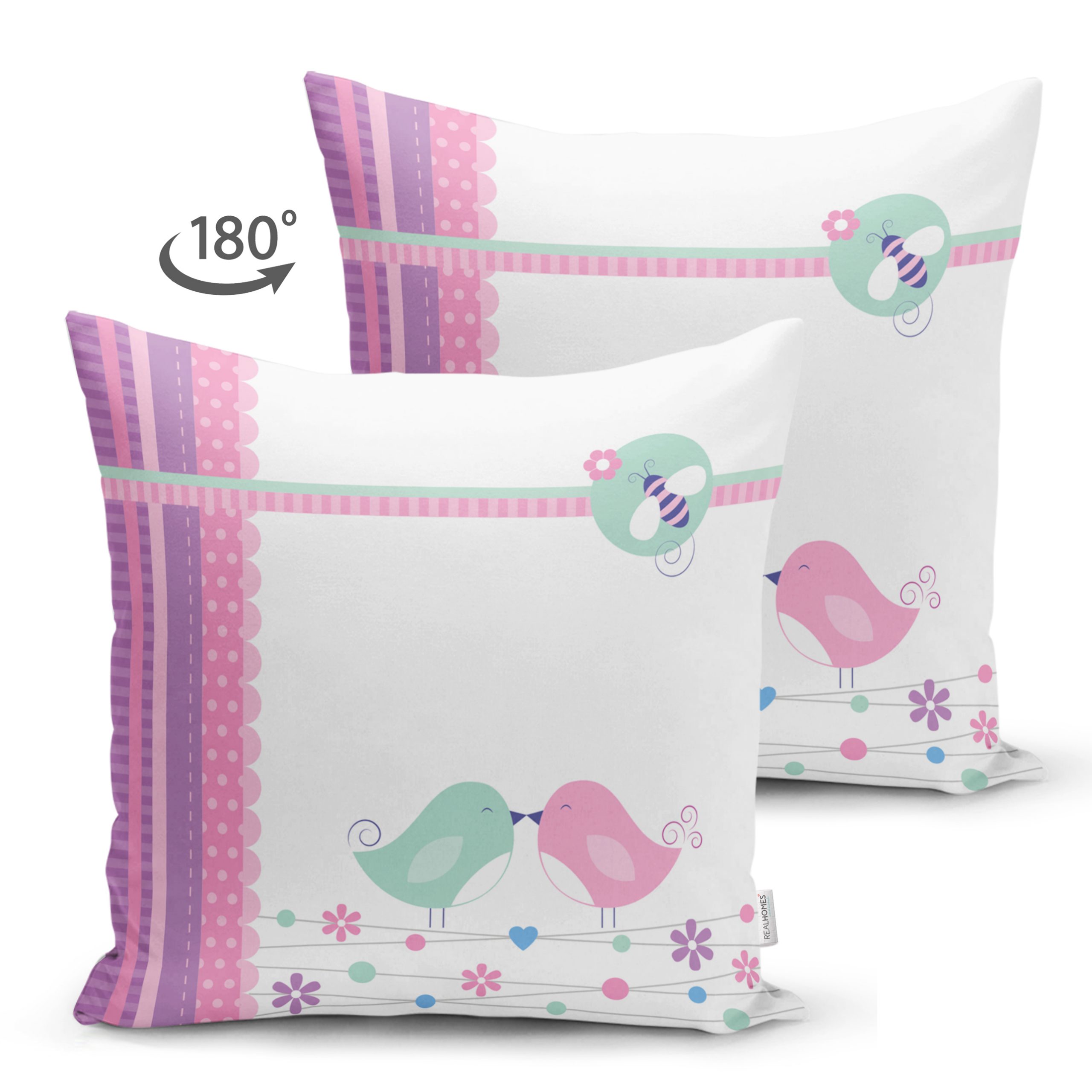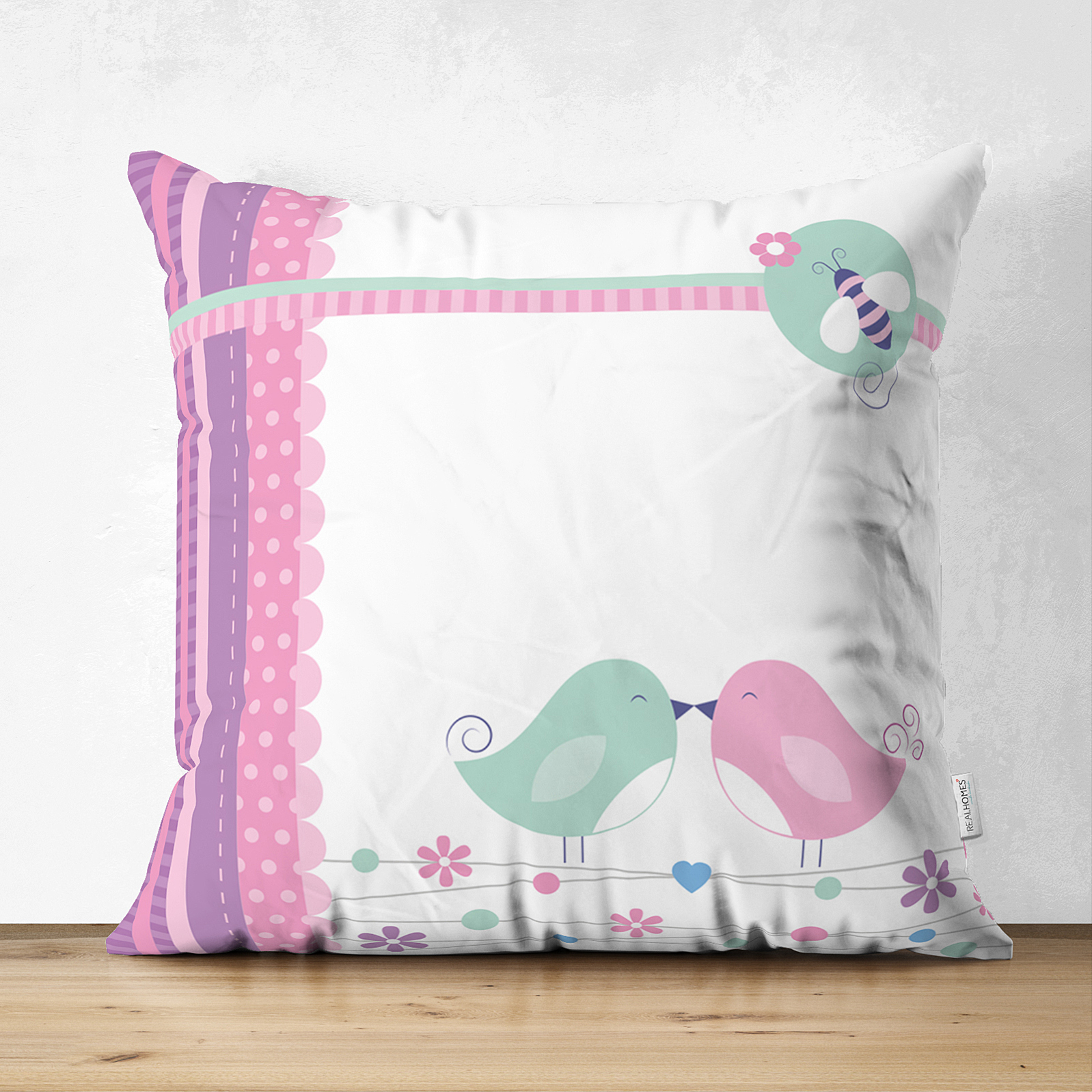 Pembe Mavi Kuşlar Çift Taraflı Dijital Baskılı Süet Yastık Kırlent Kılıfı Realhomes