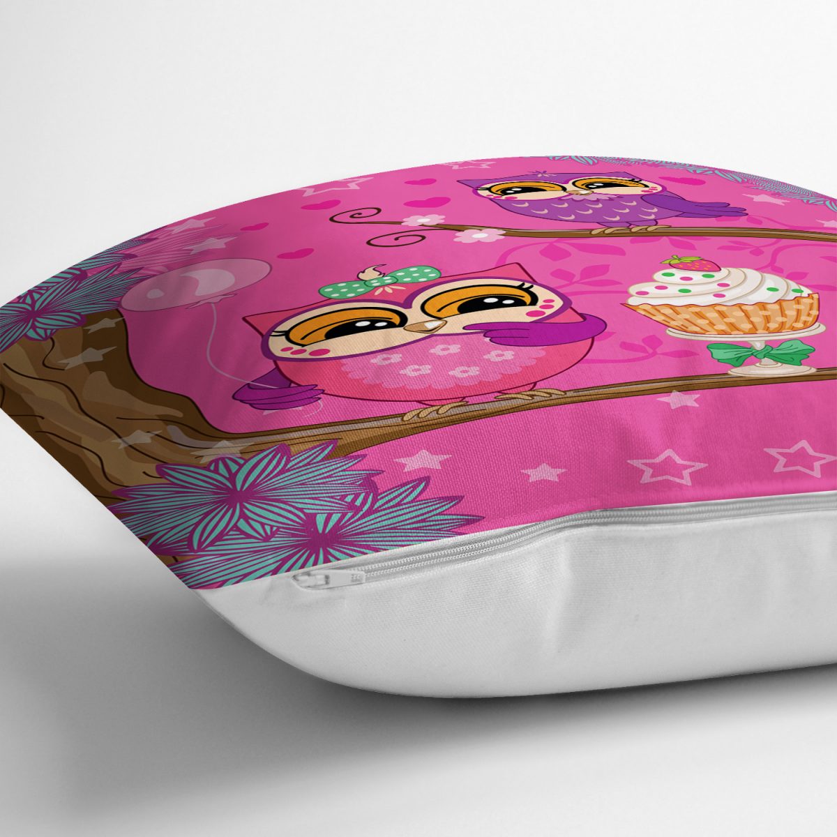 Pembe Zemimde Baykuşlar Desenli Dekoratif Yastık Kırlent Kılıfı