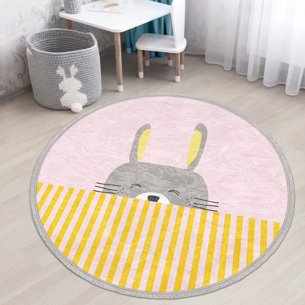 Pembe Zemin Gri Kunduz Tasarımlı Çocuk & Genç Odası Makinede Yıkanabilir Kaymaz Tabanlı Püsküllü Yuvarlak Çocuk Halısı
