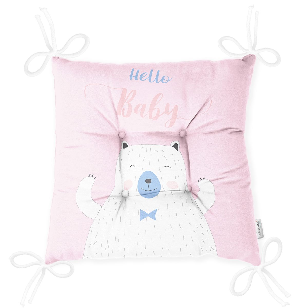 Pembe Zemin Hello Baby Yazılı Ayıcık Desenli Dijital Baskılı Modern Pofuduk Sandalye Minderi Realhomes