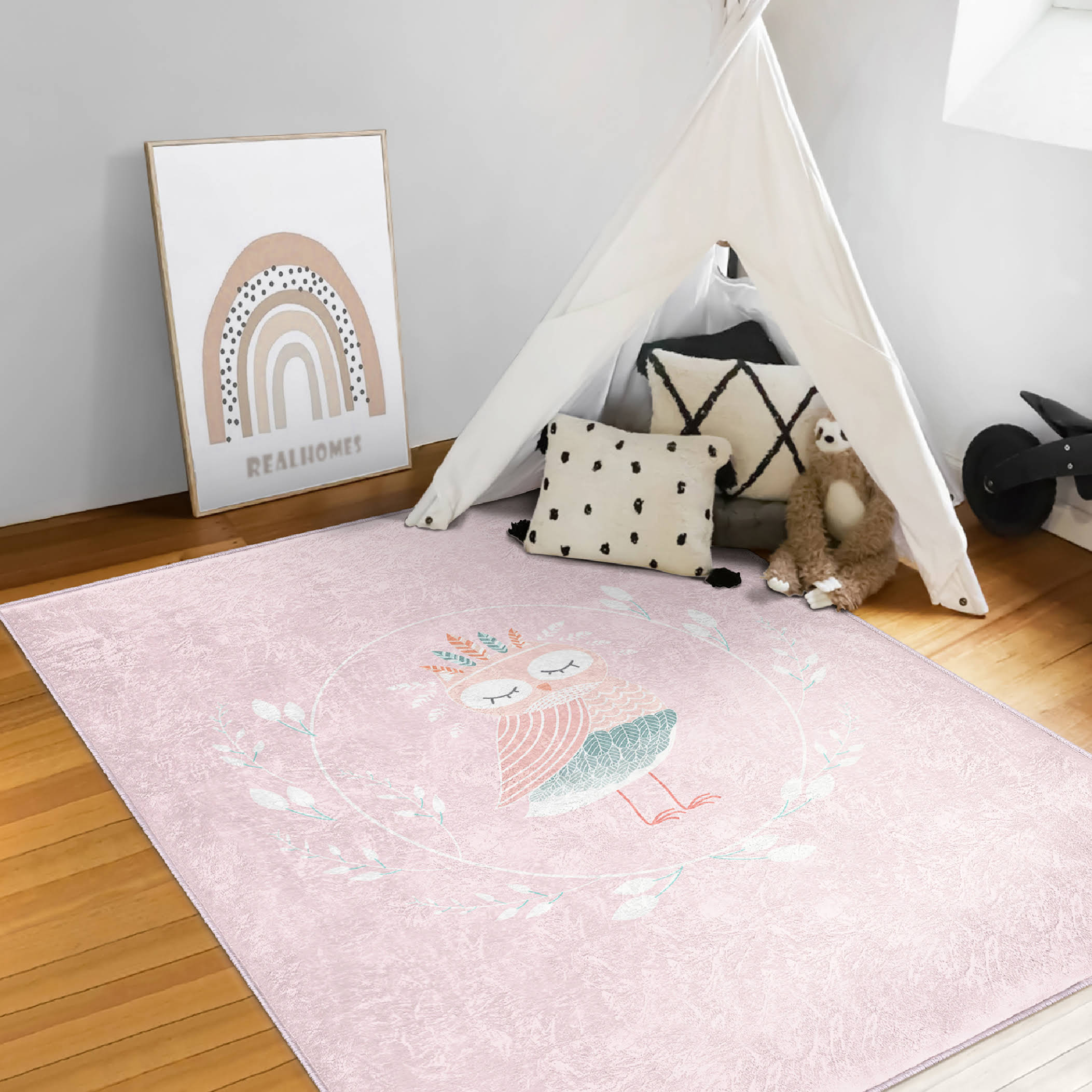 Pembe Zemin I’M Beautiful Yazılı Baykuş Motifli Çocuk & Genç Odası Makinede Yıkanabilir Kaymaz Tabanlı Kolay Temizlenebilir Leke Tutmaz Dikdörtgen Çocuk Halısı