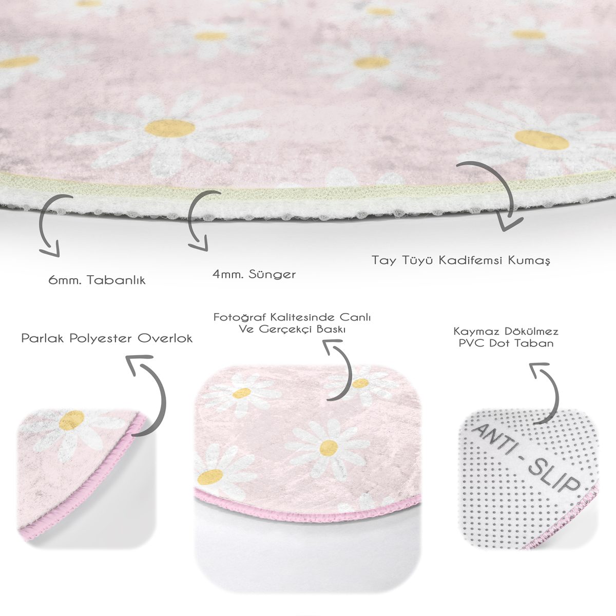 Tabanlık ve Dolgu: 10 mm Kaymaz dokuma tabanlıdır.