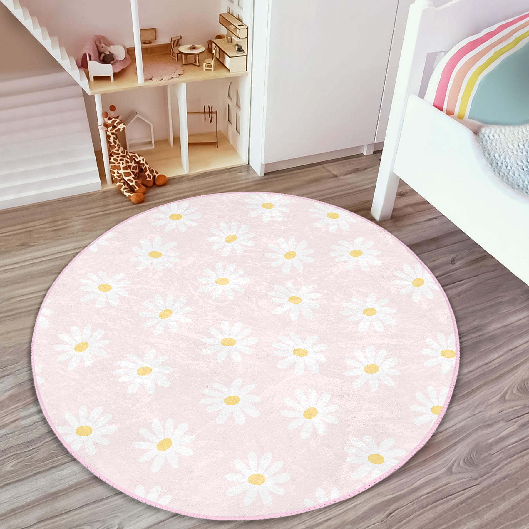 Pembe Zemin Papatya Tasarımlı Çocuk & Genç Odası Makinede Yıkanabilir Kaymaz Tabanlı Yuvarlak Çocuk Halısı