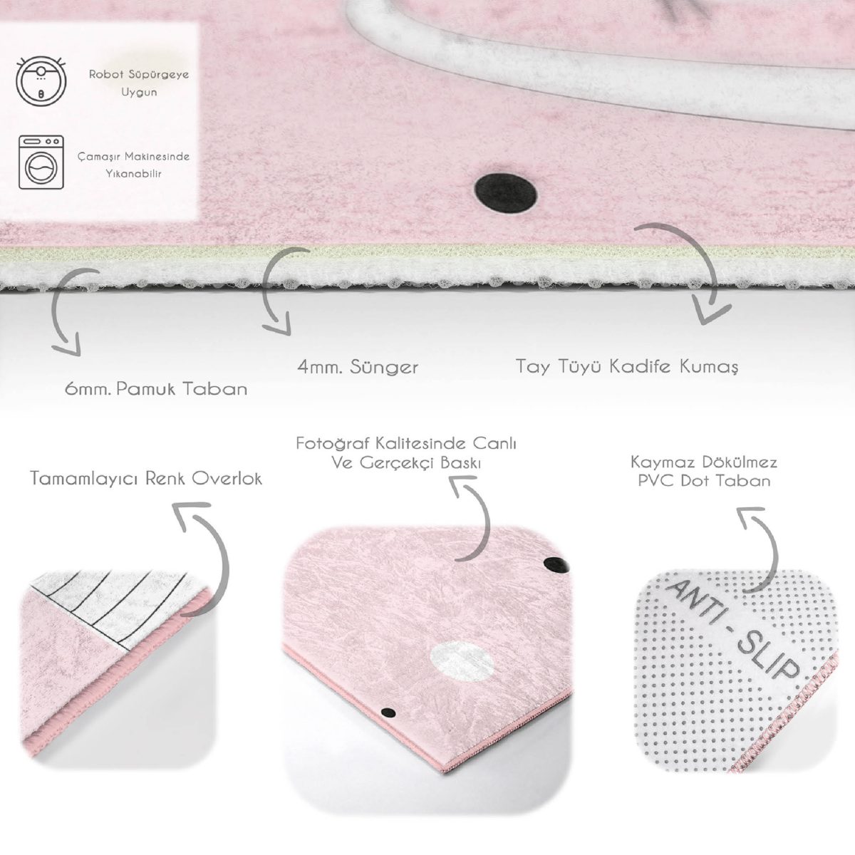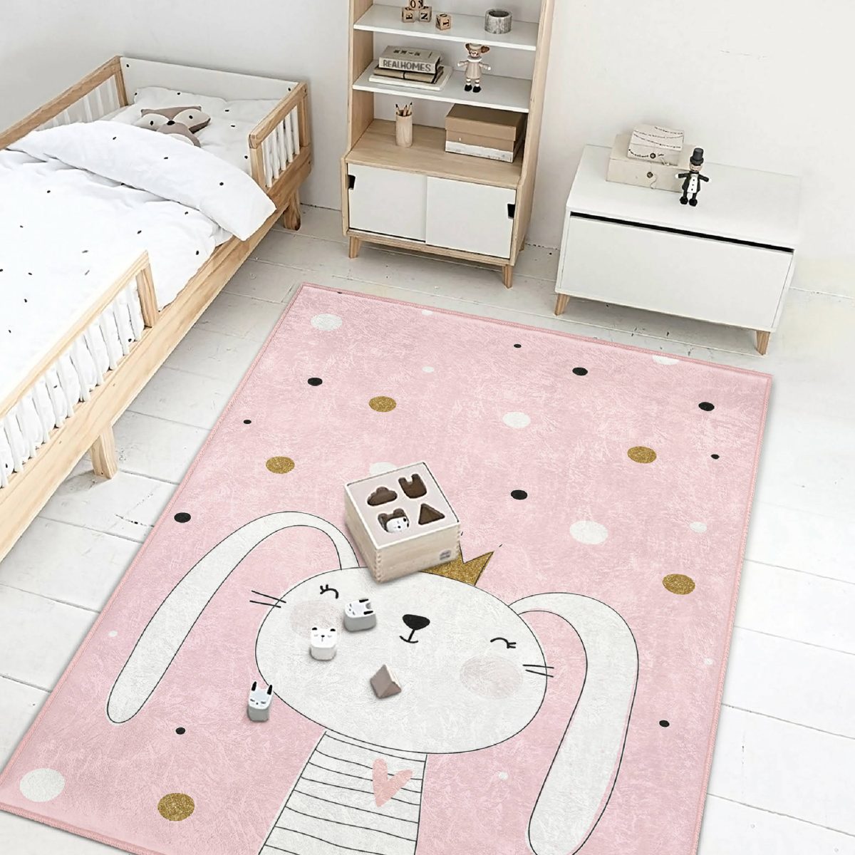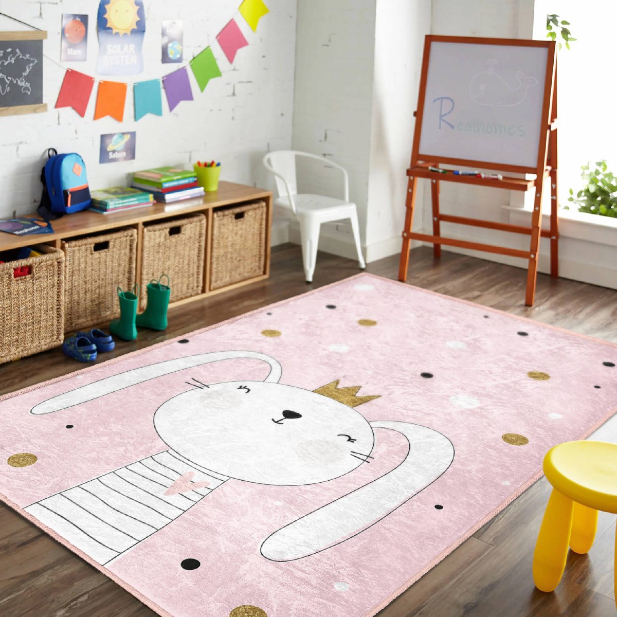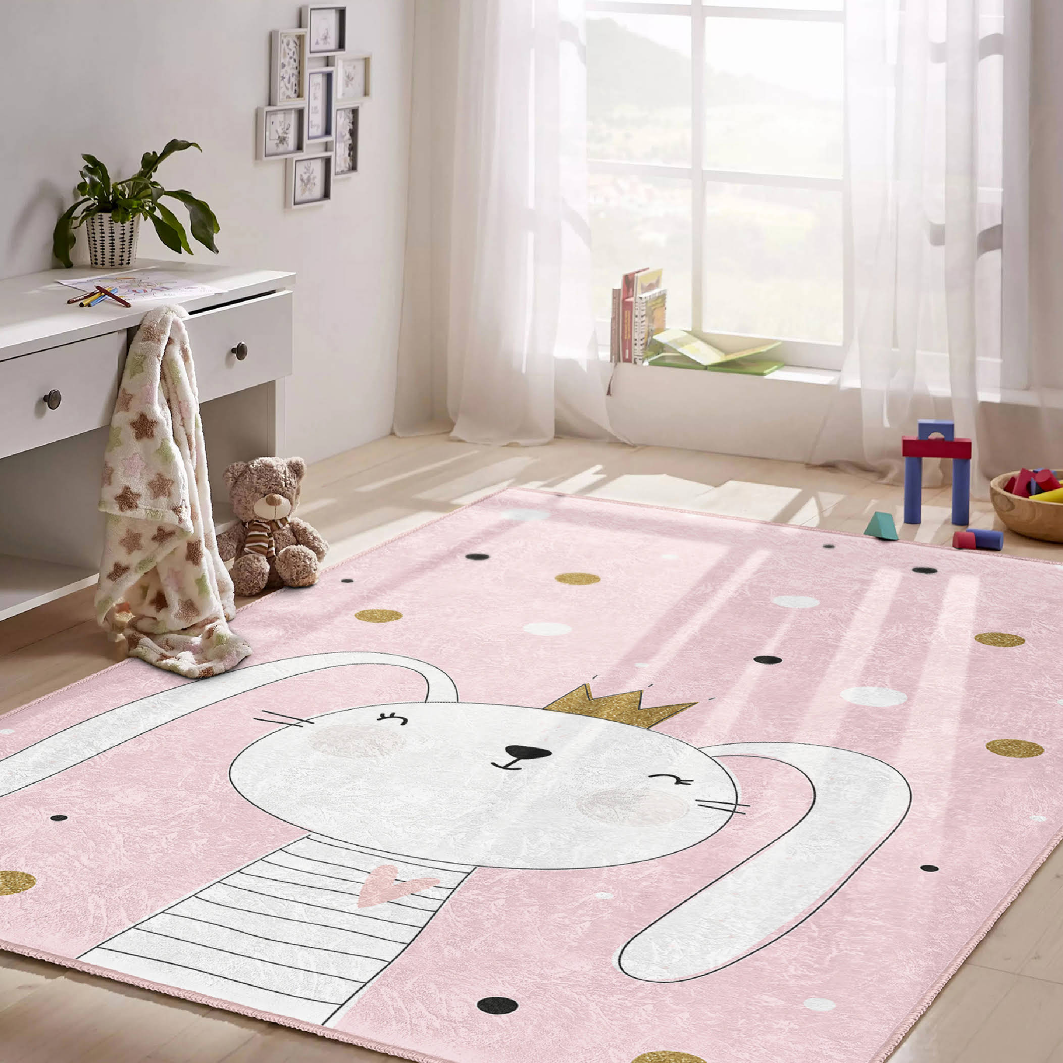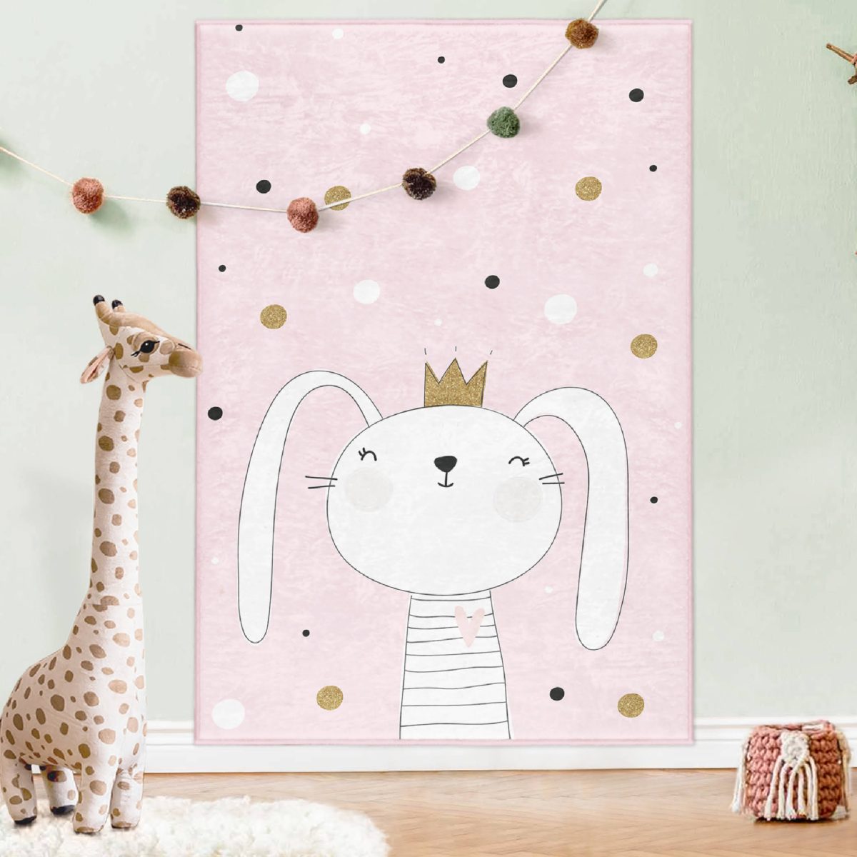 Pembe Zemin Taçlı Tavşan Tasarımlı Çocuk & Genç Odası Makinede Yıkanabilir Kaymaz Tabanlı Dekoratif Pamuk Tabanlı Dikdörtgen Çocuk Halısı