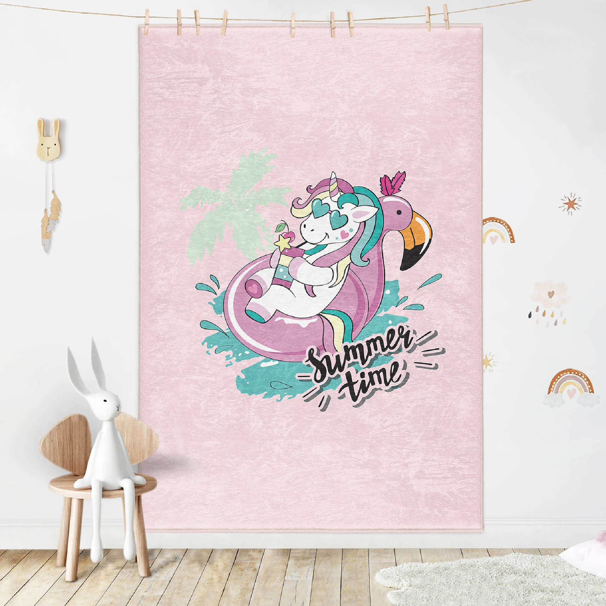 Pembe Zemin Tatil Temalı Unicorn Desenli Çocuk & Genç Odası Makinede Yıkanabilir Kaymaz Tabanlı Özel Ölçü Dekoratif Dikdörtgen Çocuk Halısı