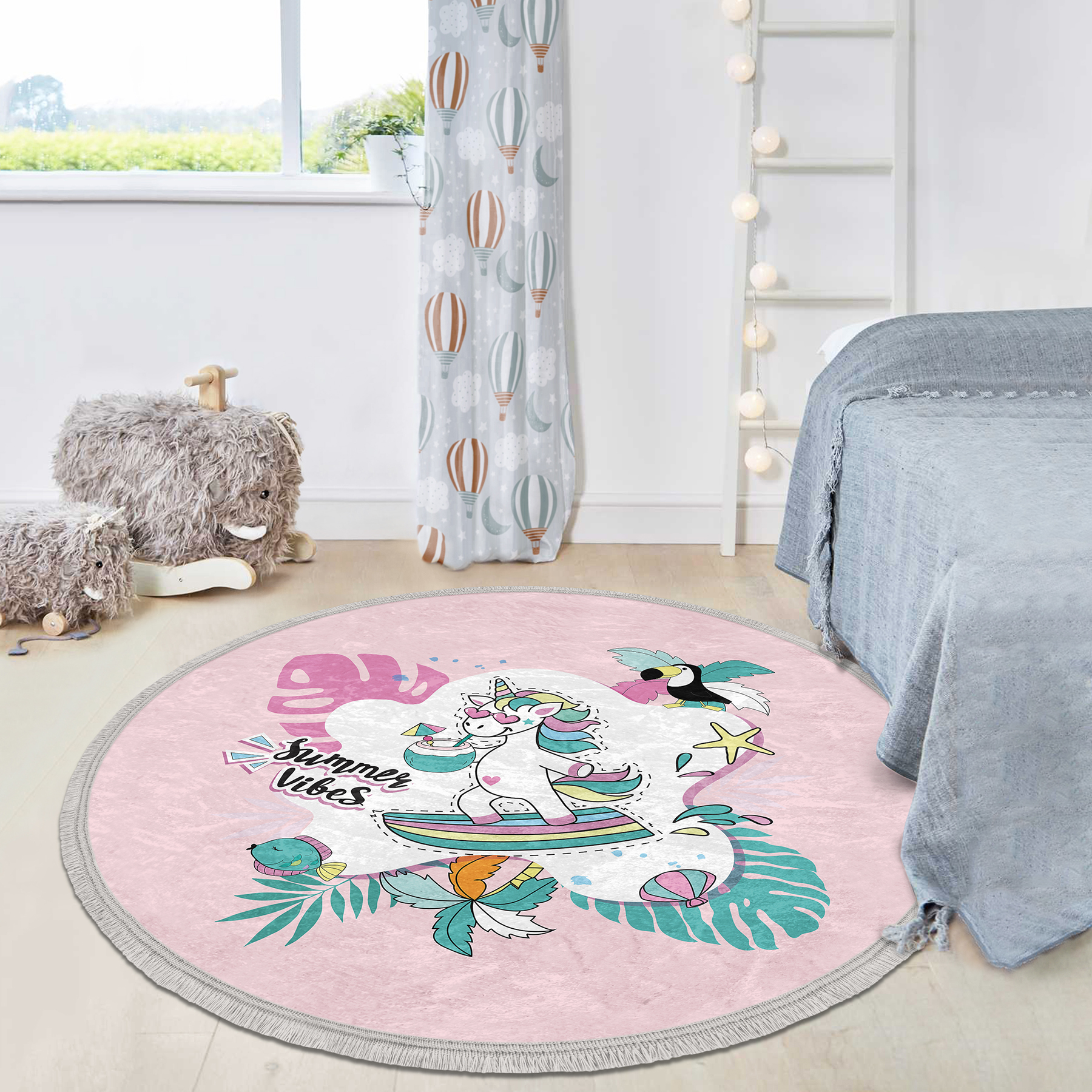 Pembe Zemin Tatil Temalı Unicorn Desenli Çocuk & Genç Odası Makinede Yıkanabilir Kaymaz Tabanlı Püsküllü Yuvarlak Çocuk Halısı