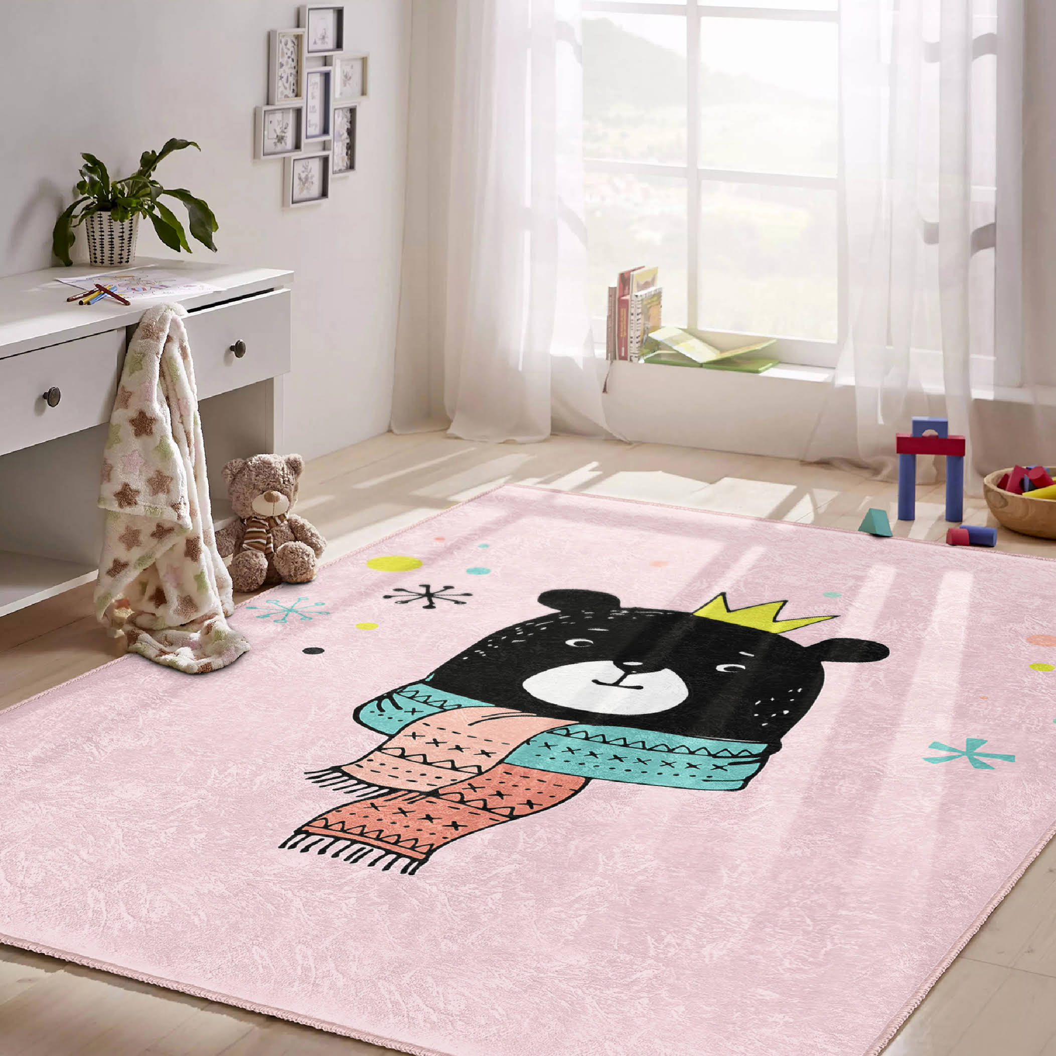 Pembe Zeminde Atkılı Ayıcık Desenli Çocuk & Genç Odası Makinede Yıkanabilir Kaymaz Tabanlı Özel Ölçü Dikdörtgen Pamuk Tabanlı Çocuk Halısı
