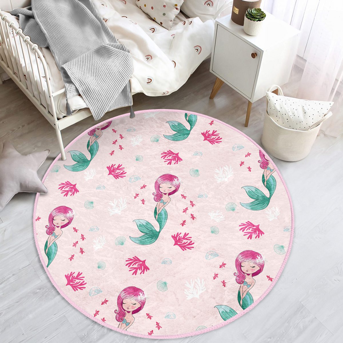 Pembe Zeminde Deniz Kızı Çocuk & Genç Odası Makinede Yıkanabilir Kaymaz Tabanlı Yuvarlak Çocuk Halısı