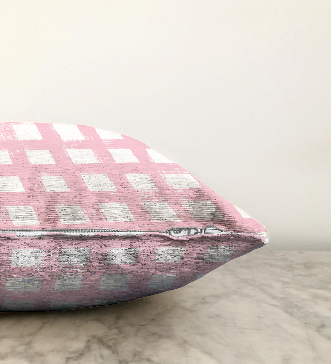 Pembe Zeminde Geometrik Kare Motifli Dekoratif Raşel Kadife Yastık Kılıfı